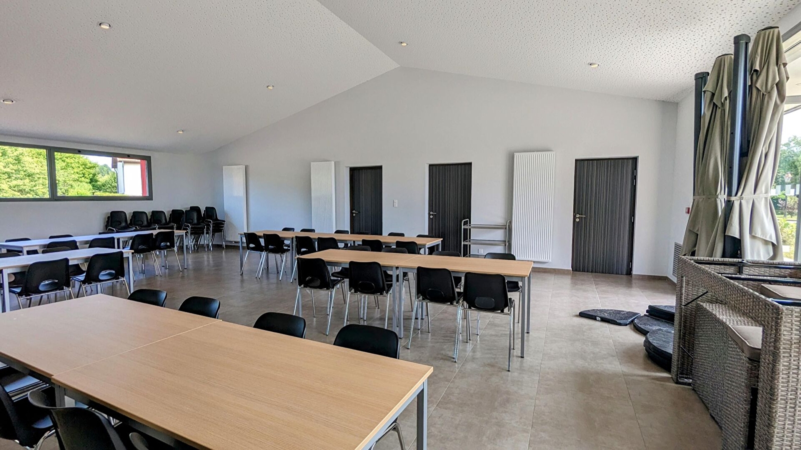 Grande salle commune avec accès à la terrasse, cuisine professionnelle entièrement équipée (lave-vaisselle, fours, frigo et congélateur) , espace sanitaires avec 4 douches (dont 1 PMR) , 5 lavabos, 3 WC + 4 urinoirs. 4 chambres /dortoirs (6 à 8 personnes). A proximité de la Saône. Draps, ménage et linge de toilette compris. Chauffage en supplément à régler sur place (15 €/jour).
