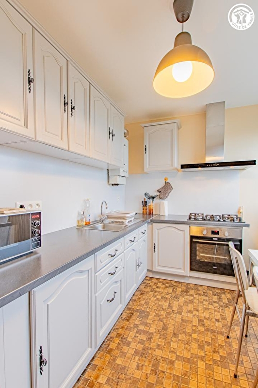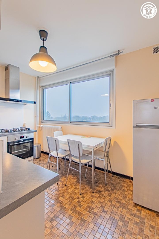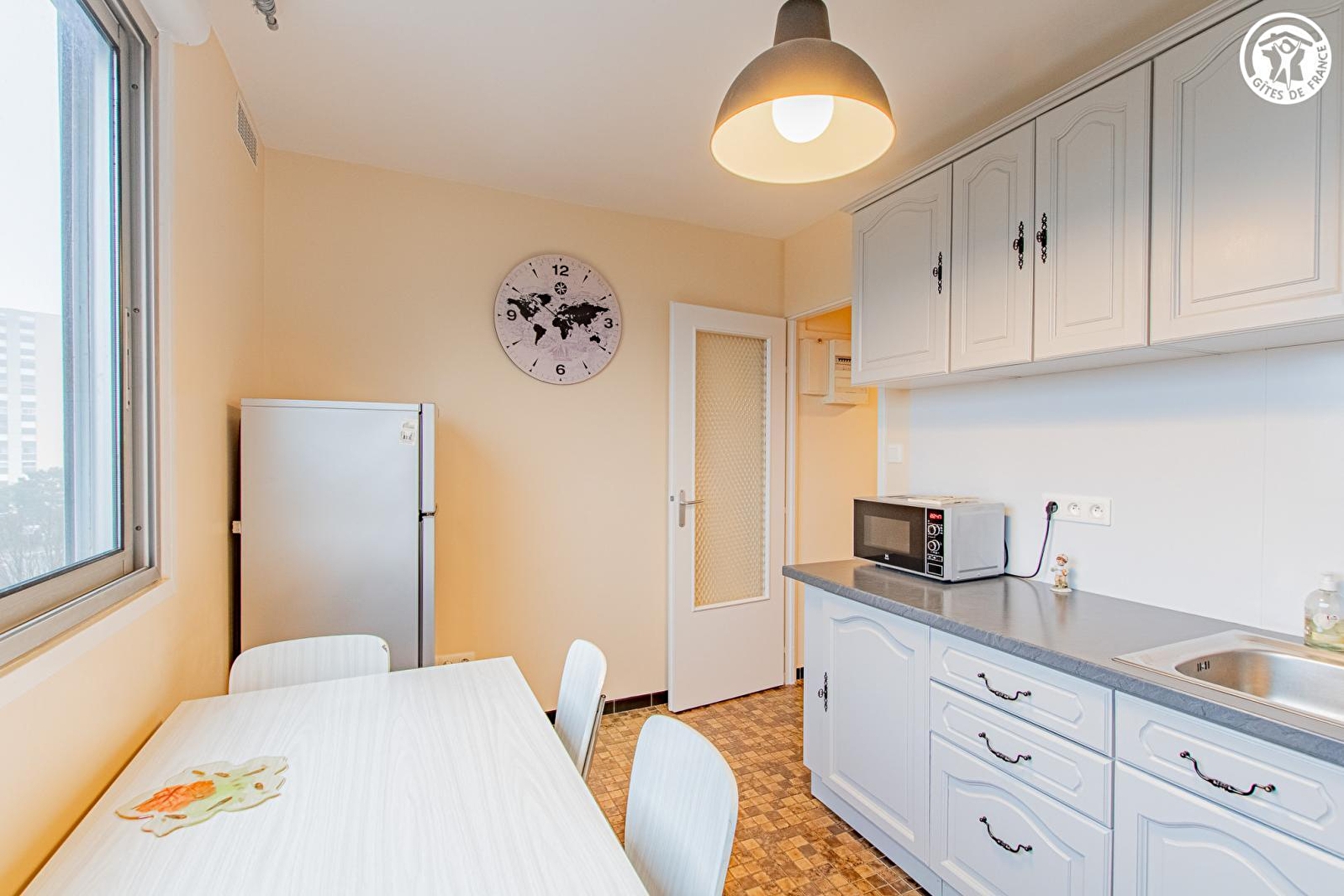 Composition : Appartement au 5ème étage d'une résidence avec ascenseur. Wifi (fibre). Chauffage urbain. Cuisine, séjour-salon, 2 chambres (1 lit 2 p. de 140x190cm / 2 lits 1 p. de 90x190cm), salle d'eau (grande douche 160x75cm), WC indépendant, buanderie. Balcon-terrasse abrité avec salon de jardin (loggia). Parking aisé sur place (double parking). Local vélos privé. Location de vélos. Commodités à moins de 1 km dont petit supermarché à 700m. Centre commercial & supermarché à 1.5 km.