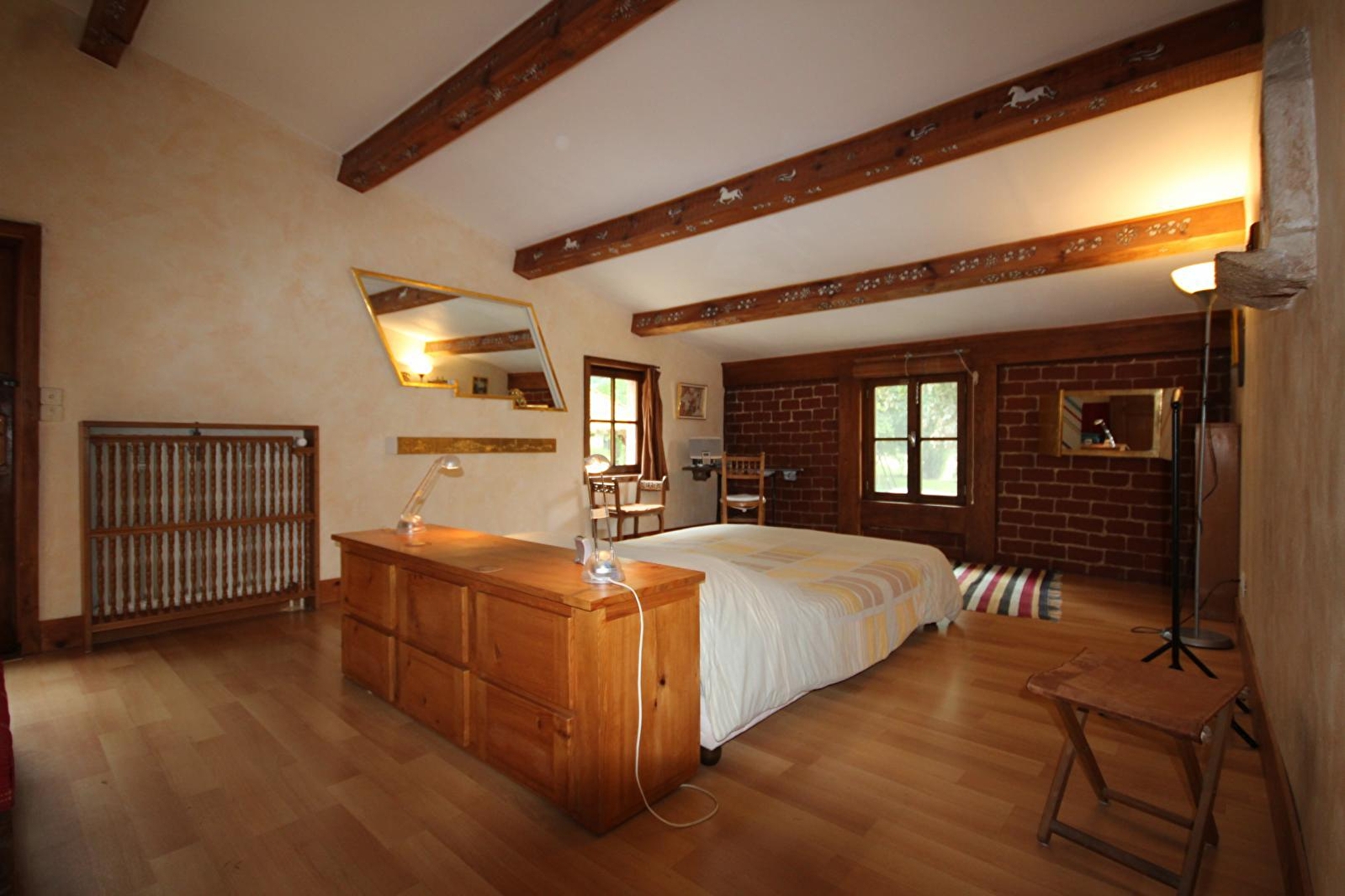 Solange & Jean-Pierre (artiste sculpteur spécialisé dans la dorure), vous accueillent au sein d'une authentique "tuilerie" du XVIIIe soigneusement restaurée sise au calme sur une rare propriété de 7ha (en partie classée aux MH pour son somptueux "séchoir"), au cœur d'un hameau rural chargé de "grande histoire", ayant jadis abrité un Prieuré fondé au XIe (dont demeurent les vestiges) dédié aux jeunes filles issues de la noblesse locale (les célèbres "Dames de Lancharre"). Parfaitement sauvegardé & riche d'un patrimoine unique (église romane classée du XIe, belles maisons typiques, pierres tombales médiévales classées, tuilerie du XVe, porte fortifiée d'une ancienne abbaye royale…), le site profite d'un bucolique écrin champêtre & naturel, lové à l'orée d'une vaste forêt au creux de verdoyantes prairies bocagères, à deux pas des premiers vignobles. Gîte de très bon confort. Belle pièce de vie au beau volume "cathédrale" baignée de lumière "sous toiture". Chaleureux cachet campagnard aux touches "design modernistes" sublimé par l'âme dépaysante du bâti originel (insolite "squelette" de colombage, poutres & tomettes). Beaucoup de charme. Large terrasse exposée & ombragée côté cour, ouverte sur un vaste parc soigné aux arbres centenaires parsemé des œuvres du propriétaire (avec table de ping-pong, balançoire, filet badminton-volley, terrain de foot…), paré d'un bucolique étang poissonneux privé avec sa barque, véritable "mini réserve naturelle" à lui seul (carpes Koï, nombreux oiseaux…).