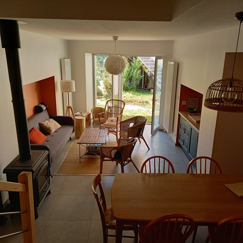 Au rez-de-chaussée : une entrée indépendante avec un grand séjour donnant sur une cuisine aménagée bien équipée, une chambre double et une SDB.