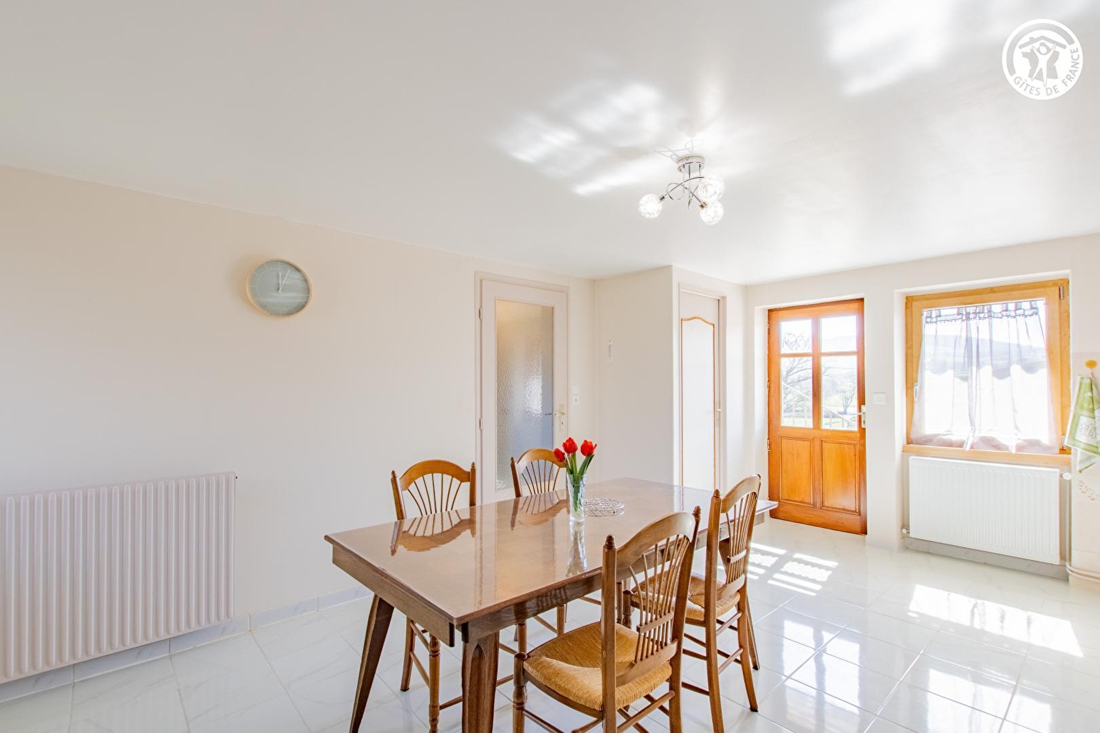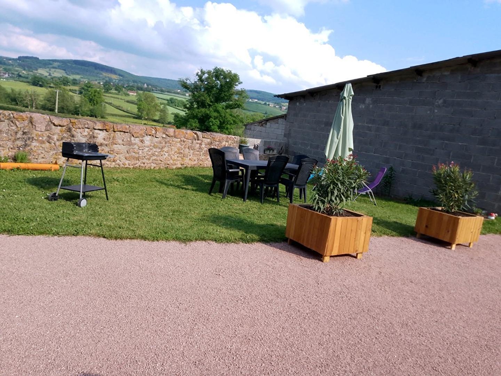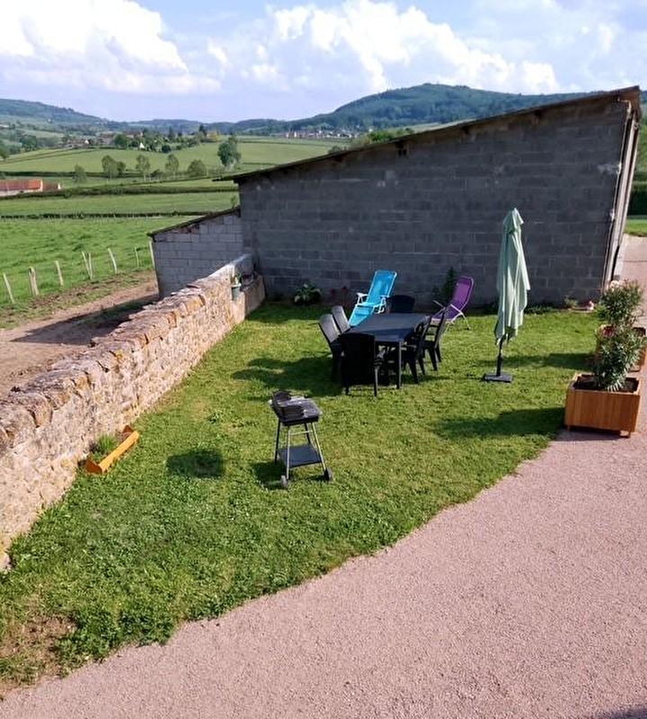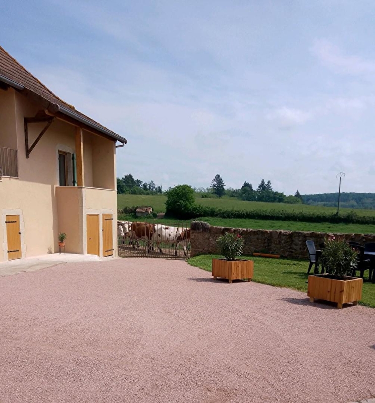 Tous deux agriculteurs retraités, Maryse & Jean-Marc vous accueillent au sein d'une authentique ferme traditionnelle du XIXème siècle, intégralement restaurée & revisitée en douce villégiature, blottie sur une petite exploitation agricole familiale d'élevage laitier exploitée par leur fils (en race "montbéliarde"). Calme & tranquillité niché en pleine campane clunisoise vallonnée (classée & protégé en "Zone Natura 2000" pour ses richesses faunistiques & floristiques), au cœur du magnifique bocage local, sous les crêtes boisées des toutes proches douces forêts sauvages, à deux pas d'une bucolique petite rivière poissonneuse. Splendide panorama & cadre paysagé, juché en "balcon" & "belvédère panoramique" à flanc de colline sur un coteau sud exposé, au sein d'un hameau rural "dispersé" (agricole & résidentiel) dominant le paisible petit village de Buffières, pittoresque bourg parfaitement sauvegardé riche d'une élégante église romane édifiée au XIIème siècle, lové sur les contreforts de la vaste forêt domaniale des Trois Monts (littéral "poumon vert" du territoire à parcourir lors de reposantes balades à pied ou VTT). Décor champêtre & naturel préservé de carte postale, 100% relaxant & apaisant. Gîte de bon confort. Dépaysant chaleureux cachet campagnard mixant touches contemporaines & charme "vintage". Agréable jardinet sis en bordure des prés, ouvert sur la vaste cour de la propriété. Balcon exposé & abrité offrant une splendide vue dégagée sur la campagne environnante.