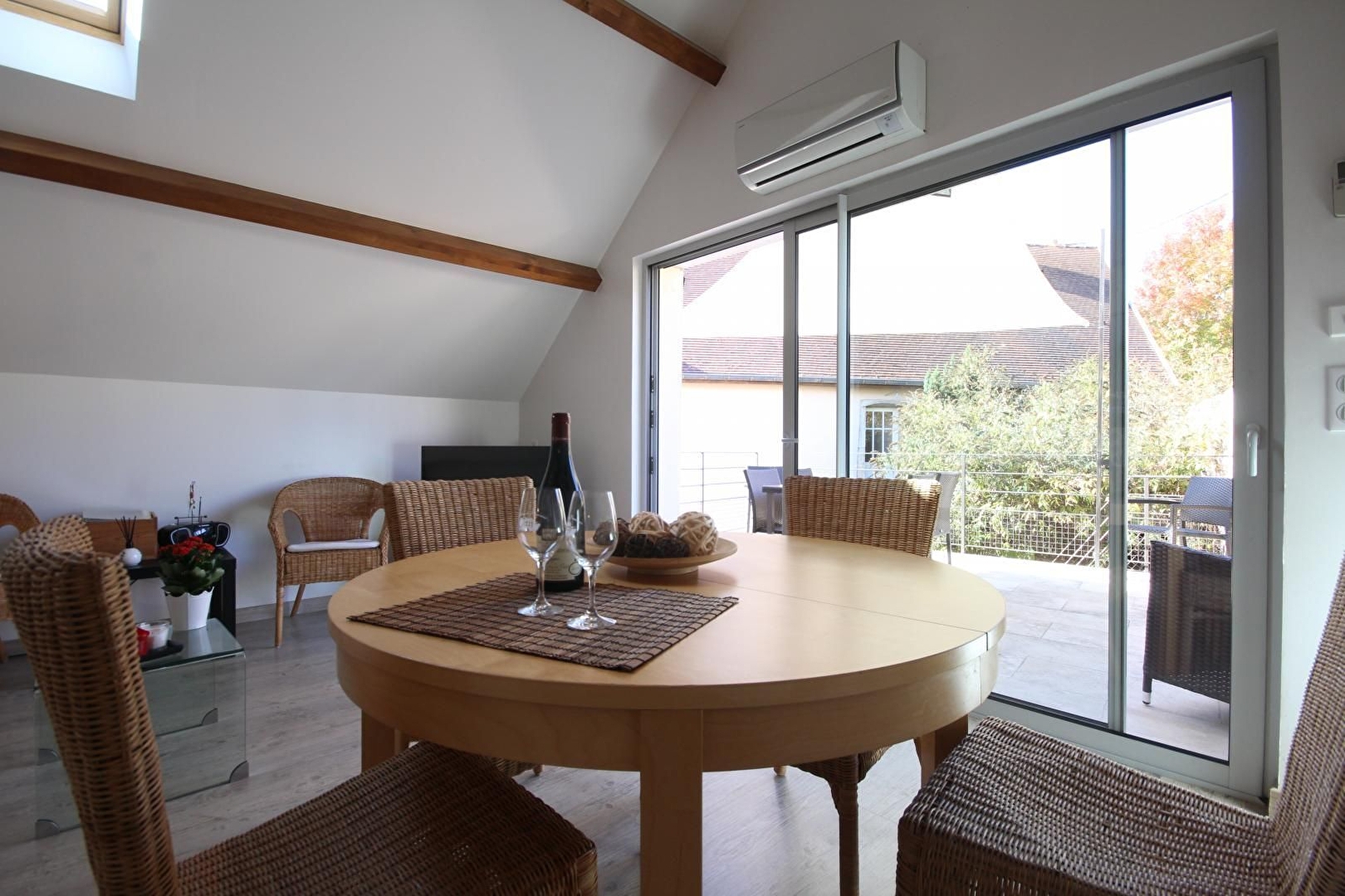 Sur la route des grands vins de Bourgogne, le gîte du Château, entièrement rénové, se situe sur l'exploitation viticole, au cœur d'un parc de 2 hectares dans une maison indépendante en face du château. Gite aménagé à l'étage : une cuisine moderne équipée ouverte sur le salon/salle à manger, 2 chambres avec respectivement, 1 lit 160 et 2 lits 90x200 jumelables, une belle salle d'eau avec douche à l'italienne et un WC séparé. Terrasse close et sécurisée par laquelle on descend au sauna par infrarouge à disposition des vacanciers. Parking privé au sein du château, accès au parc, pêche dans l'étang privé, jeux pour enfants. Lit pliant, chaise haute, matelas à langer et baignoire enfant pour les tout-petits. Wifi dans le gîte.