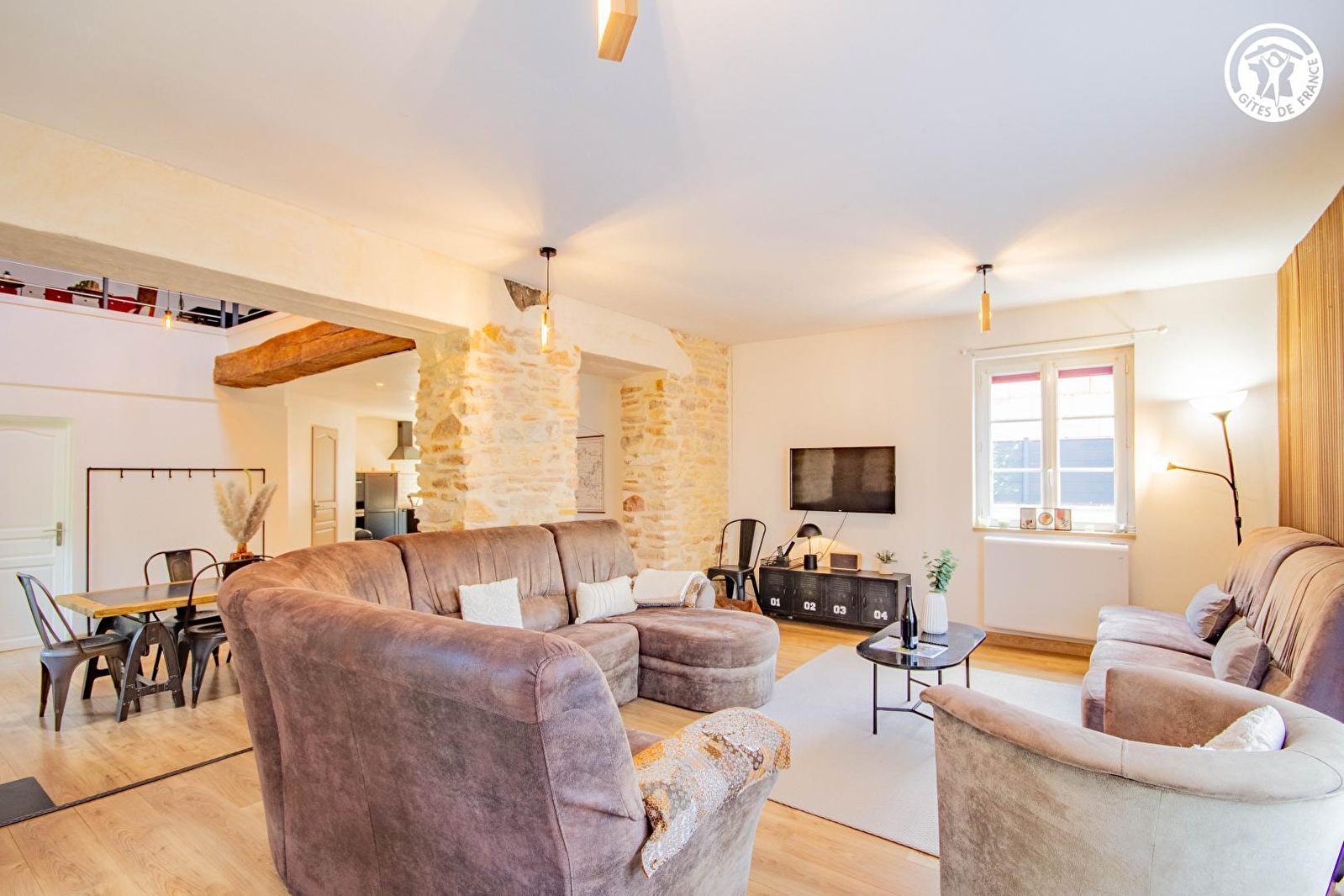 Amandine & Thimotée vous accueillent au sein d'une charmante authentique demeure traditionnelle du XVIIIe soigneusement réhabilitée, voisinant l'élégante maison de maître qu'ils occupent, également parfaitement restaurée, lovée sur une propriété familiale "bourgeoise" de 5 ha, chargée d'histoire & très soignée. Apaisant environnement champêtre préservé alentour, niché en lisière d'une plaine de champs de culture & prairies, à l'orée d'une vaste forêt (en partie privée), aux confins du bourg & ses nombreuses commodités (dont supermarchés), proche du bucolique "Étang de Chaumont" (site naturel de promenades et de découverte de la faune & flore). En pleine douce campagne périurbaine chalonnaise préservée, doté de divers espaces protégés en ZNIEFF & "Zone Natura 2000" pour ses riches écosystèmes, magnifique écrin vallonné mixant belles forêts sauvages (dont deux vastes "forêts domaniales" toutes proches), prairies & coteaux de vignobles. Gîte de très bon confort. Ultra spacieux. Vaste pièce de vie en partie dotée d'un beau "volume cathédrale". Chaleureux cachet campagnard aux accents contemporains d'esprit "industriels" dialoguant avec les riches traces du bâti d'origine (murs & piliers en pierres, poutres & charpente d'époque). Large terrasse exposée, ombragée l'été. Agréable jardinet arboré, végétalisé & fleuri bordé par les anciennes douves du domaine (parfaitement sécurisées) agrémentées d'une dépaysante passerelle en bois pour accéder au gîte (autre accès possible par la cour).