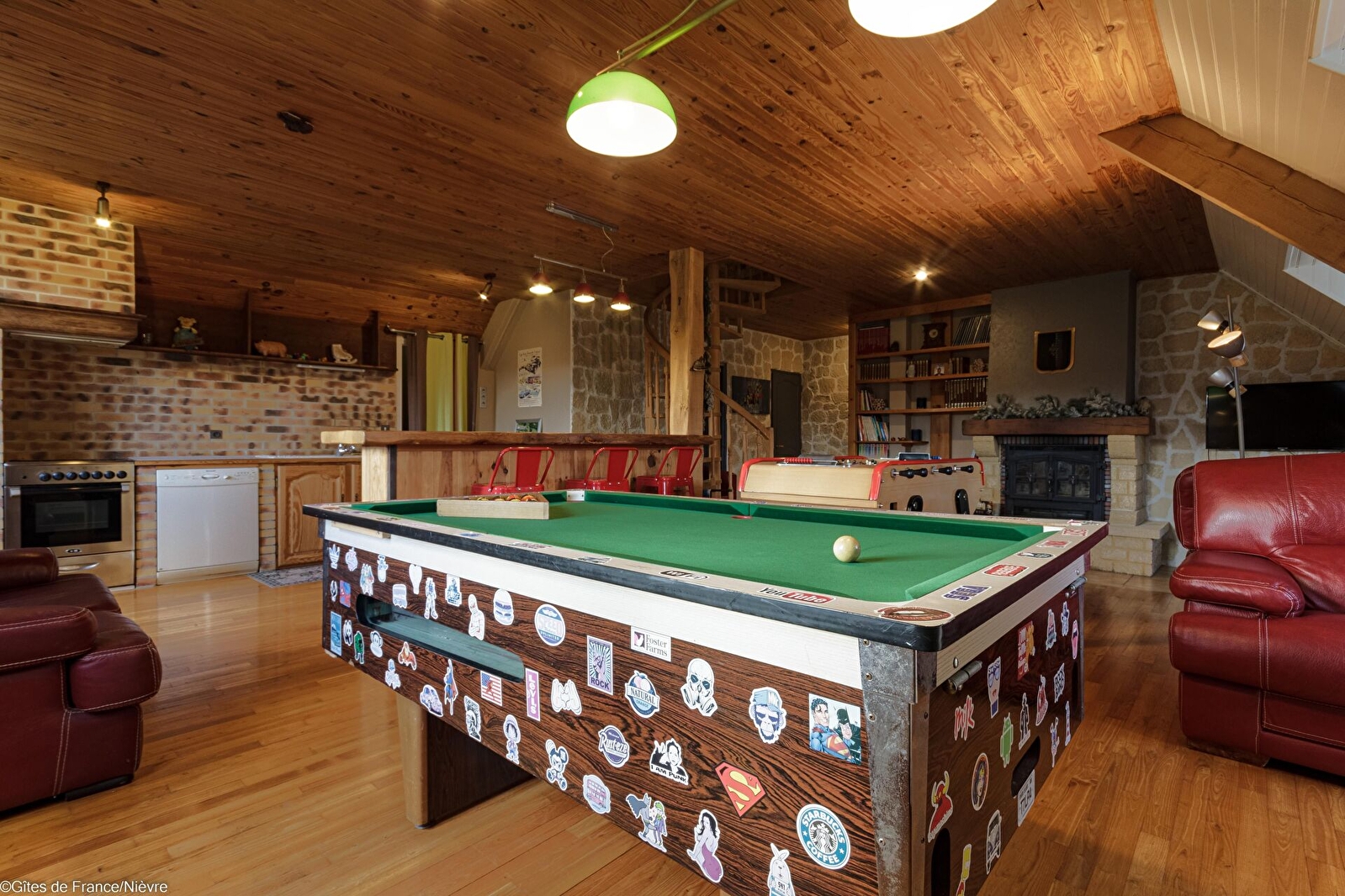 Au 1er étage : 2 chambres ayant chacune 1 lit 160x200, wc indépendant, 1 salle d'eau avec douche grande dimension et double vasque; une grande pièce à vivre (bibliothèque, babyfoot et billard).