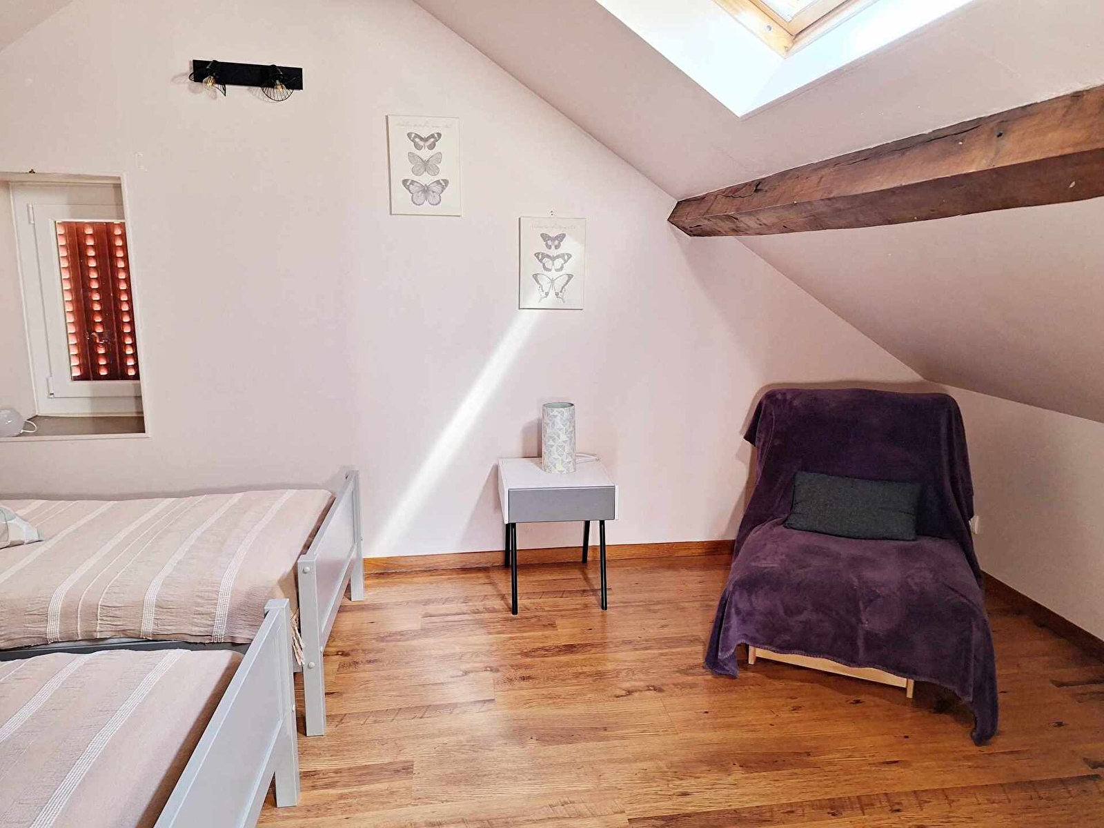 1 chambre avec 2 lits simples en 90 et un lit d'appoint type futon en 80 de large (enfant).