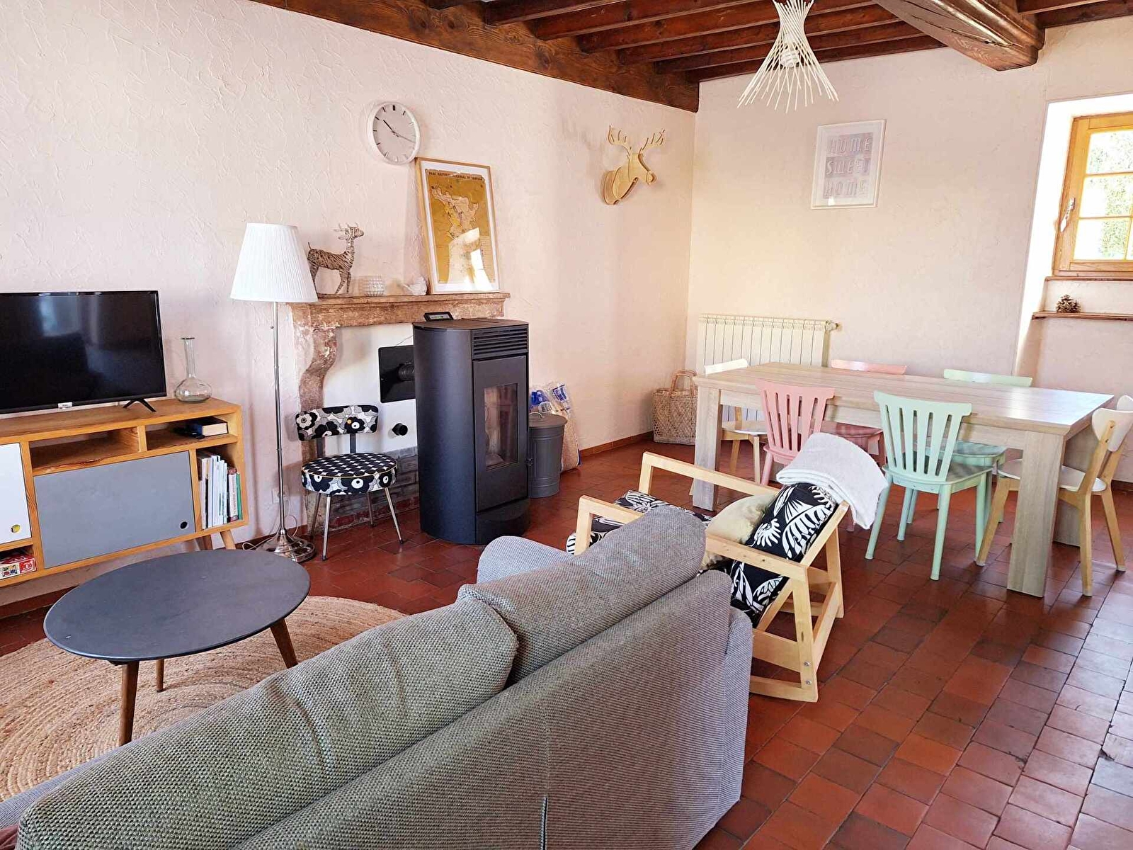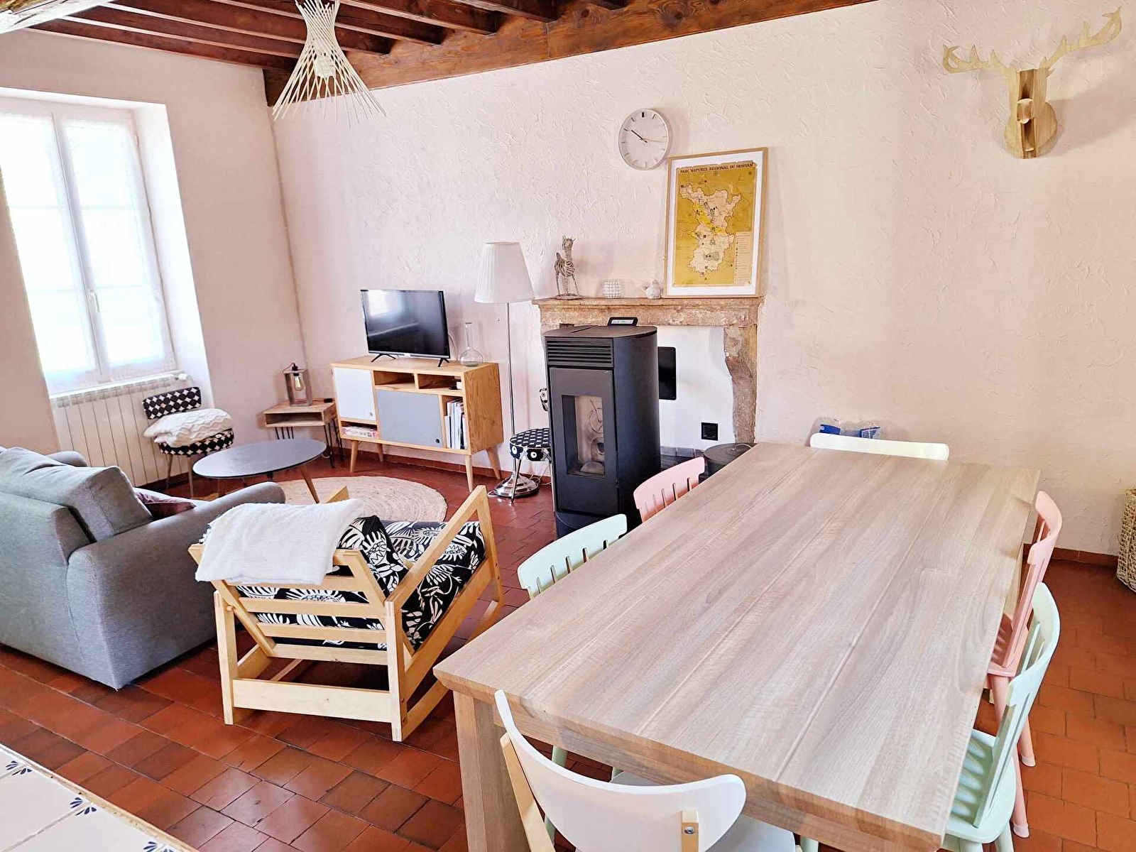 RDC : pièce à vivre avec un agréable poêle à granulés, coin salon (canapé convertible), coin salle à manger et cuisine ouverte toute équipée (four, lave vaisselle, plaque induction, micro-onde).