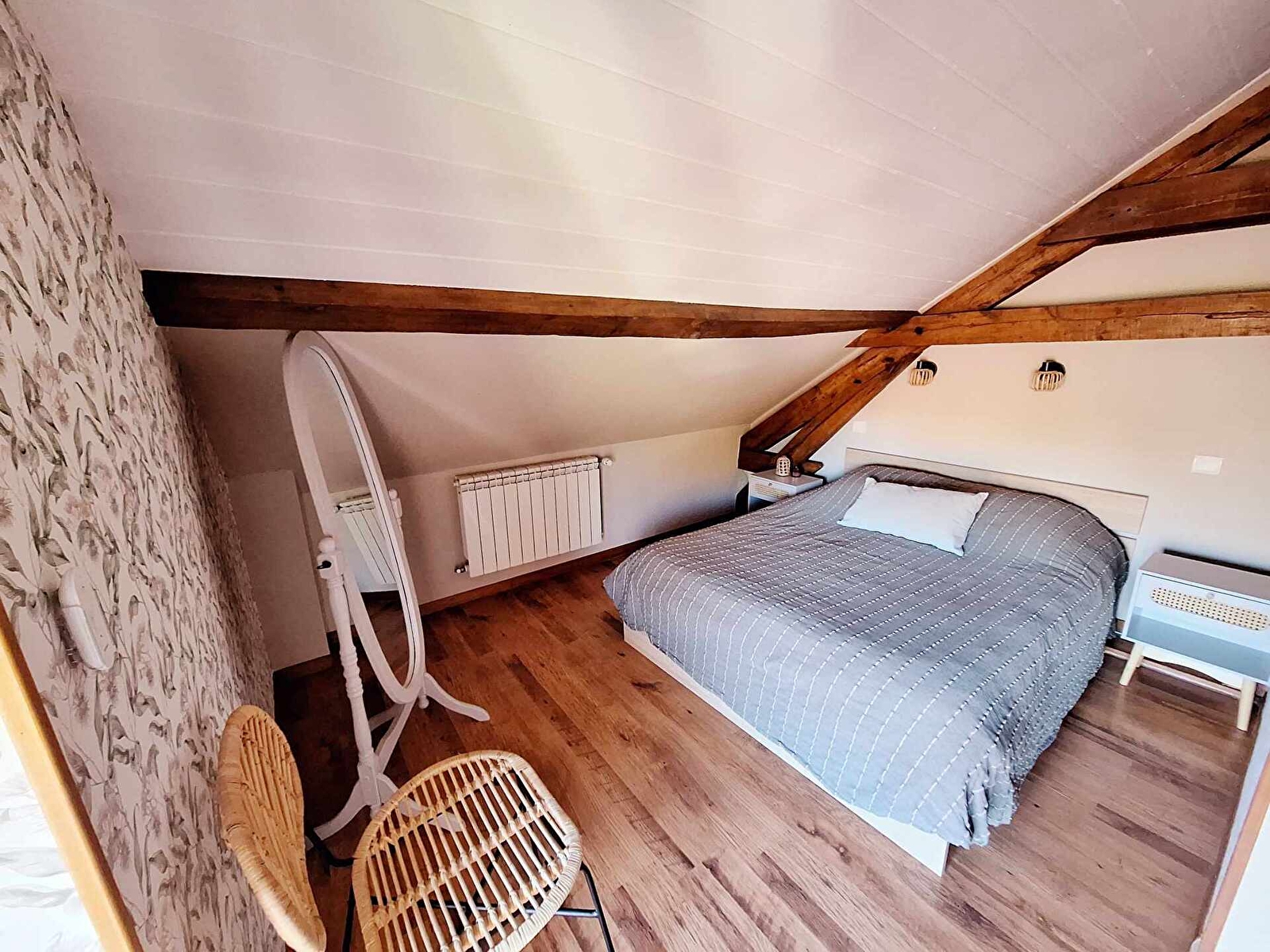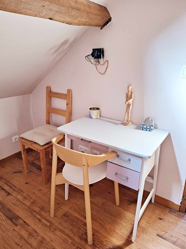 A l'étage : 1 chambre avec poutres apparentes, 1 lit double de 140.