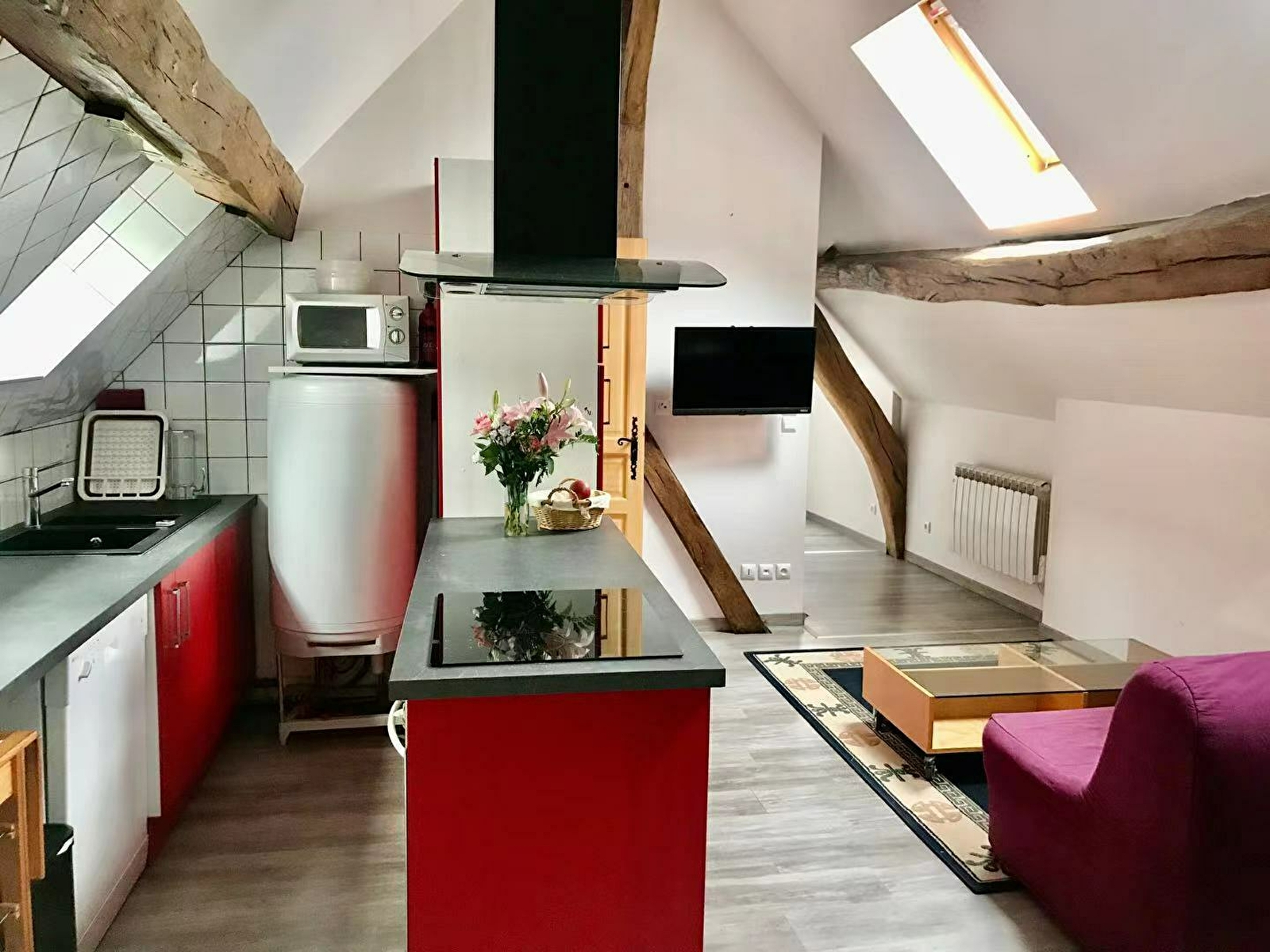 Séjour avec cuisine américaine entièrement équipée (réfrigérateur/congélateur – plaque de cuisson électrique 4 feux – four pyrolyse – hotte – four micro-ondes – lave-vaisselle – cafetière - évier 2 bacs) – table ronde et 6 chaises – buffet – partie séjour avec TV connectée, table basse et canapé-lit BZ 2 personnes. Salle d’eau avec douche italienne et WC – sèche-cheveux – sèche serviettes.
