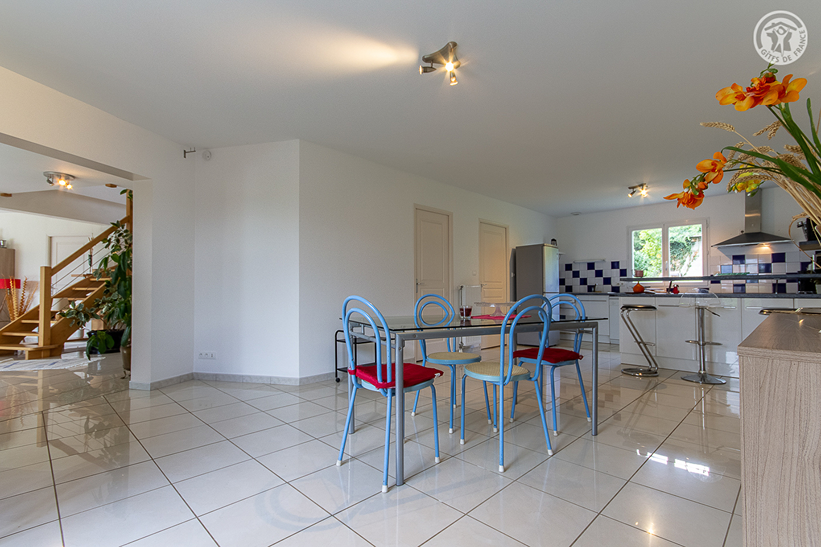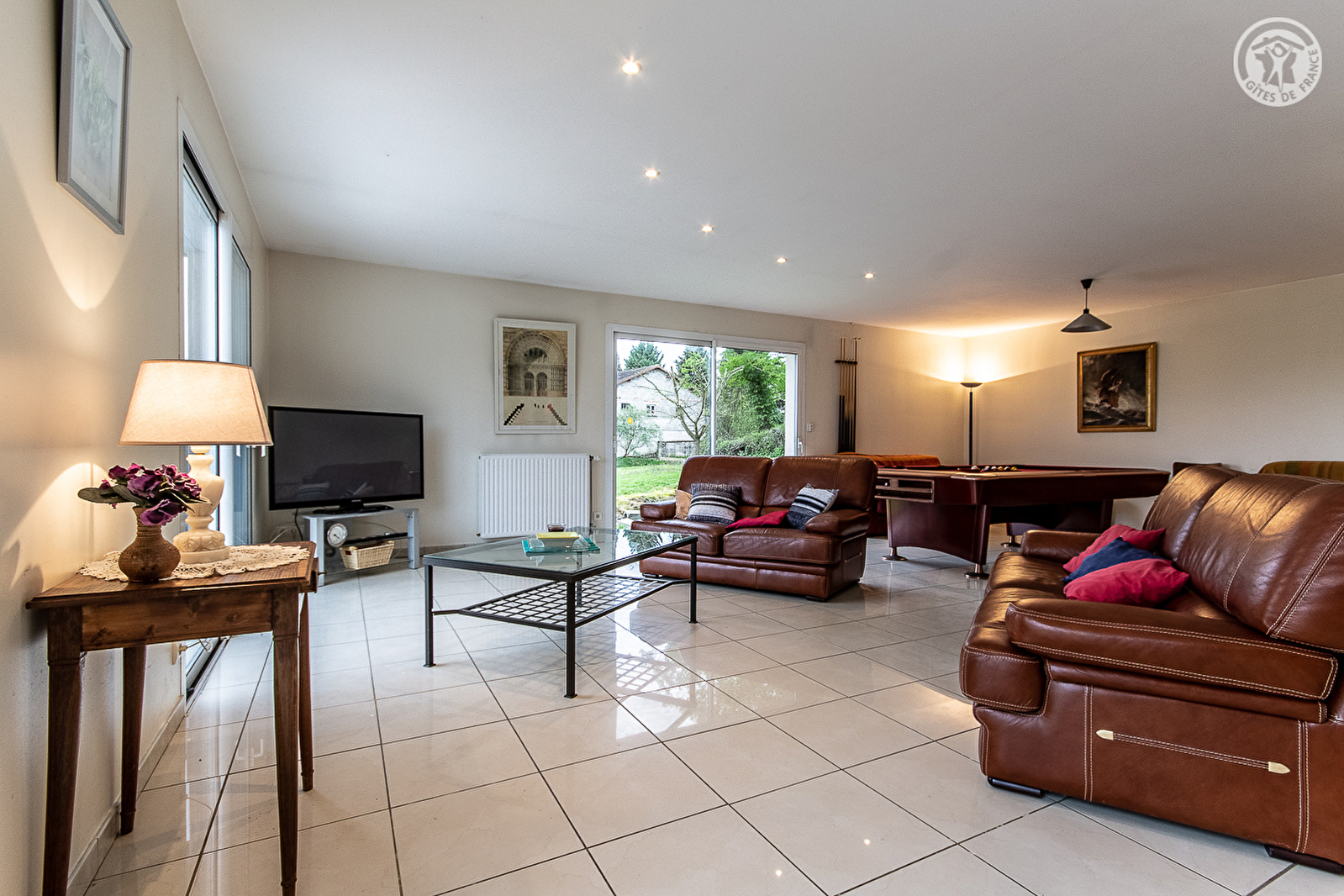Composition du gîte : Maison individuelle sur 2 niveaux (rdc + 1er étage). Wifi. Chauffage central fioul. Rdc : séjour-cuisine-salon (vaste pièce ouverte avec espaces cuisine et salon-séjour bien délimités / cuisine avec cellier / billard à disposition côté salon). 2 chambres (1 lit 2 p. 160x20 - 1 lit 2 p. 140x190 / 1 avec TV), salle d'eau (douche), WC indépendant. 1er étage : 1 chambre (1 lit 2 p. 140x190cm), salon en mezzanine donnant accès à un balcon. Jardin + double terrasse (une couverte). Parking privé (garages non accessibles). Chaise et lit bébé à disposition. Commerces & services à 6 km. Baignade biologique publique à la Chapelle Saint Sauveur à 12 km.