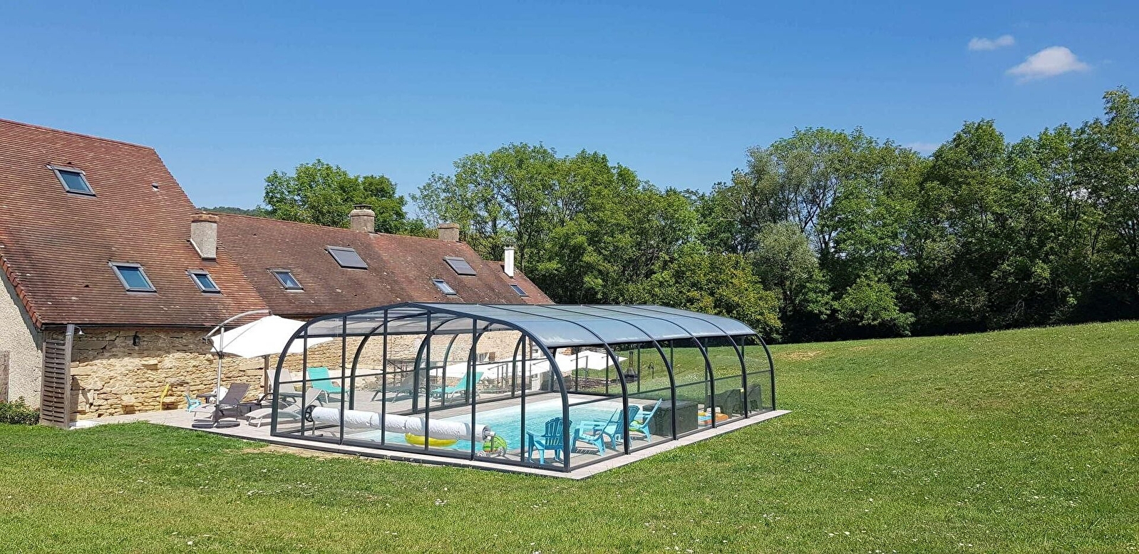 Grand terrain de 13000 m² avec piscine couverte (chauffée en option) ouverte de Pâques à Mi-Octobre (9x4 m, profondeur de 0,50 m à 1,80 m). Grande terrasse. Salon de jardin avec parasols, transats. Barbecue et plancha. Grange aménagée avec ping-pong, jeux de fléchettes, molki, etc...Grand terrain de pétanque. Petit ruisseau sur la propriété (les enfants sont sous la responsabilité des parents).