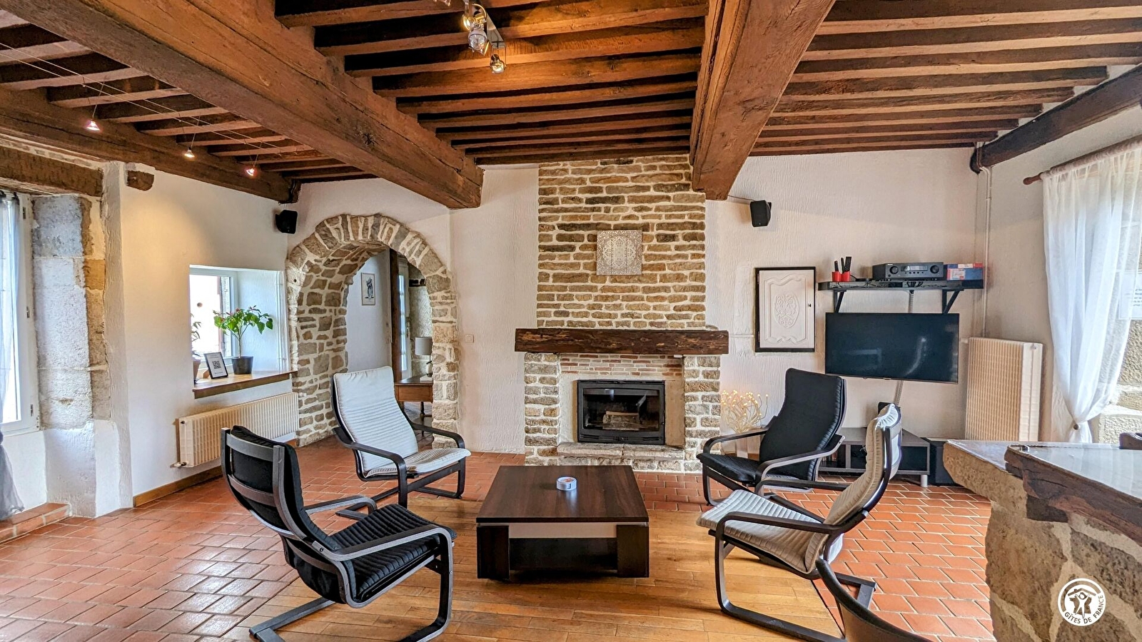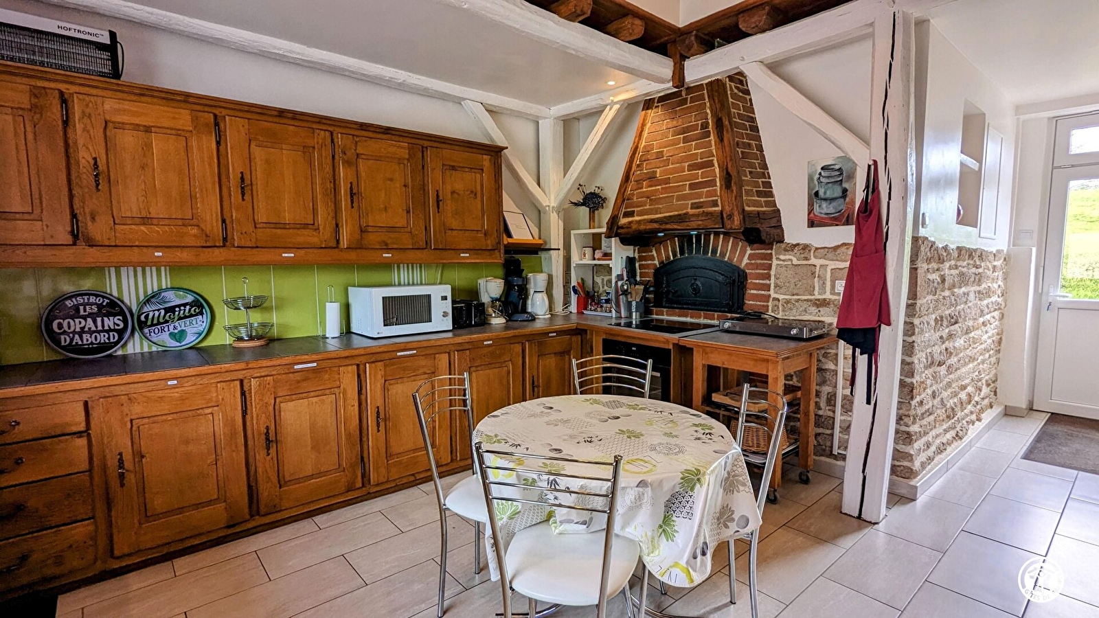Au rez-de-chaussée : 1 salon avec canapé, fauteuils, TV, cheminée à insert, WIFI, bar avec petit frigo et sono, 1 salle à manger, 1 cuisine entièrement équipée, 1 buanderie avec lave-linge et sèche-linge, 1 salle d'eau avec WC et 1 WC indépendant.