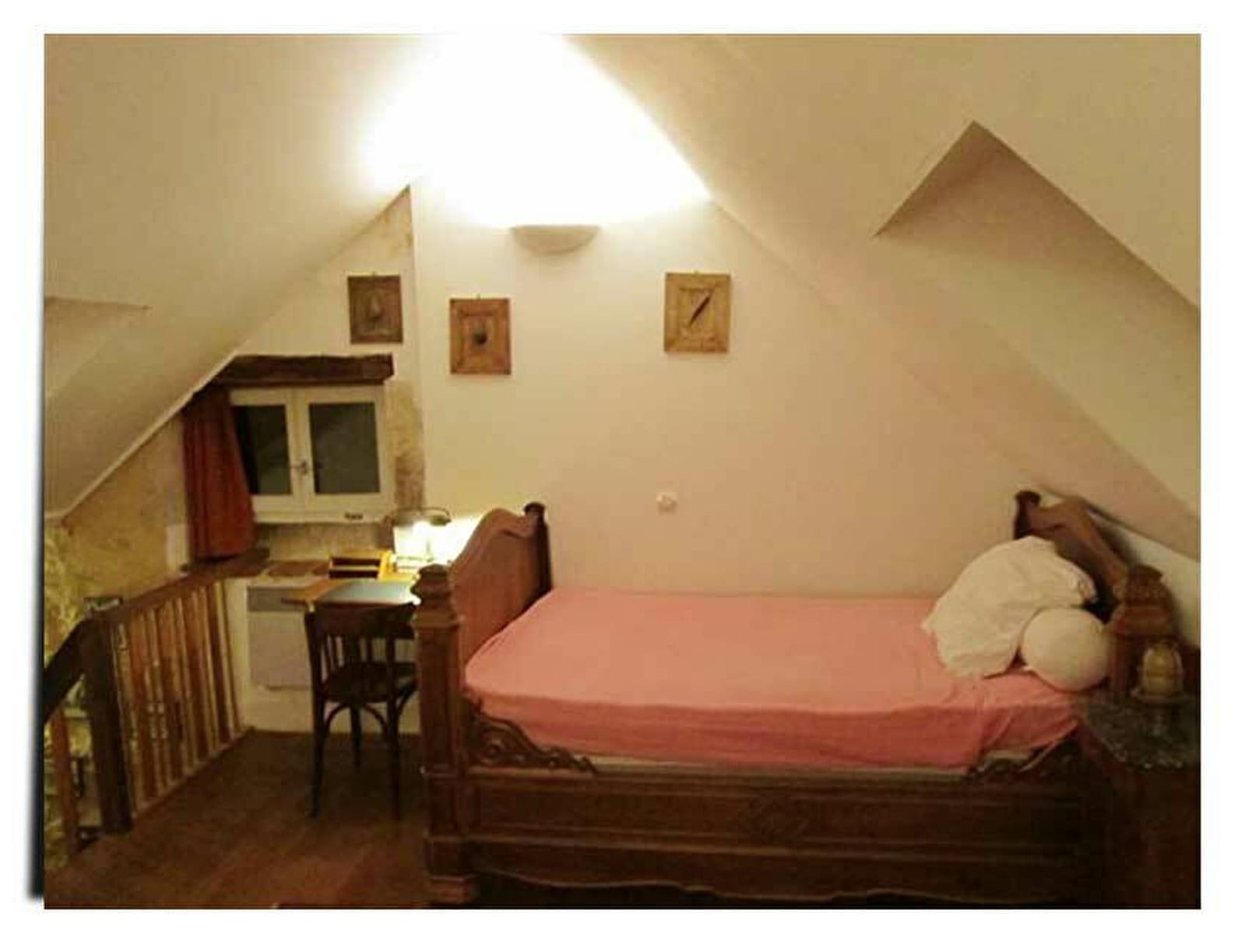 Nous proposons également un petit gîte de 35 m2 pour 2/3 personnes équipé plus simplement, aménagé dans la grange mitoyenne, il est composé au 1er étage d'une grande chambre avec un lit de 2 pers. (160 cm), et au rez-de-chaussée d'une kitchenette d'appoint ouverte sur un petit séjour (avec télévision), d'un lit d'une personne (90 cm) et d'une salle d'eau avec wc. En face des gîtes se trouve une chambre d'hôtes indépendante avec salle de bains, wc et petit salon, aménagée dans l'ancien four à pain du Moulin.