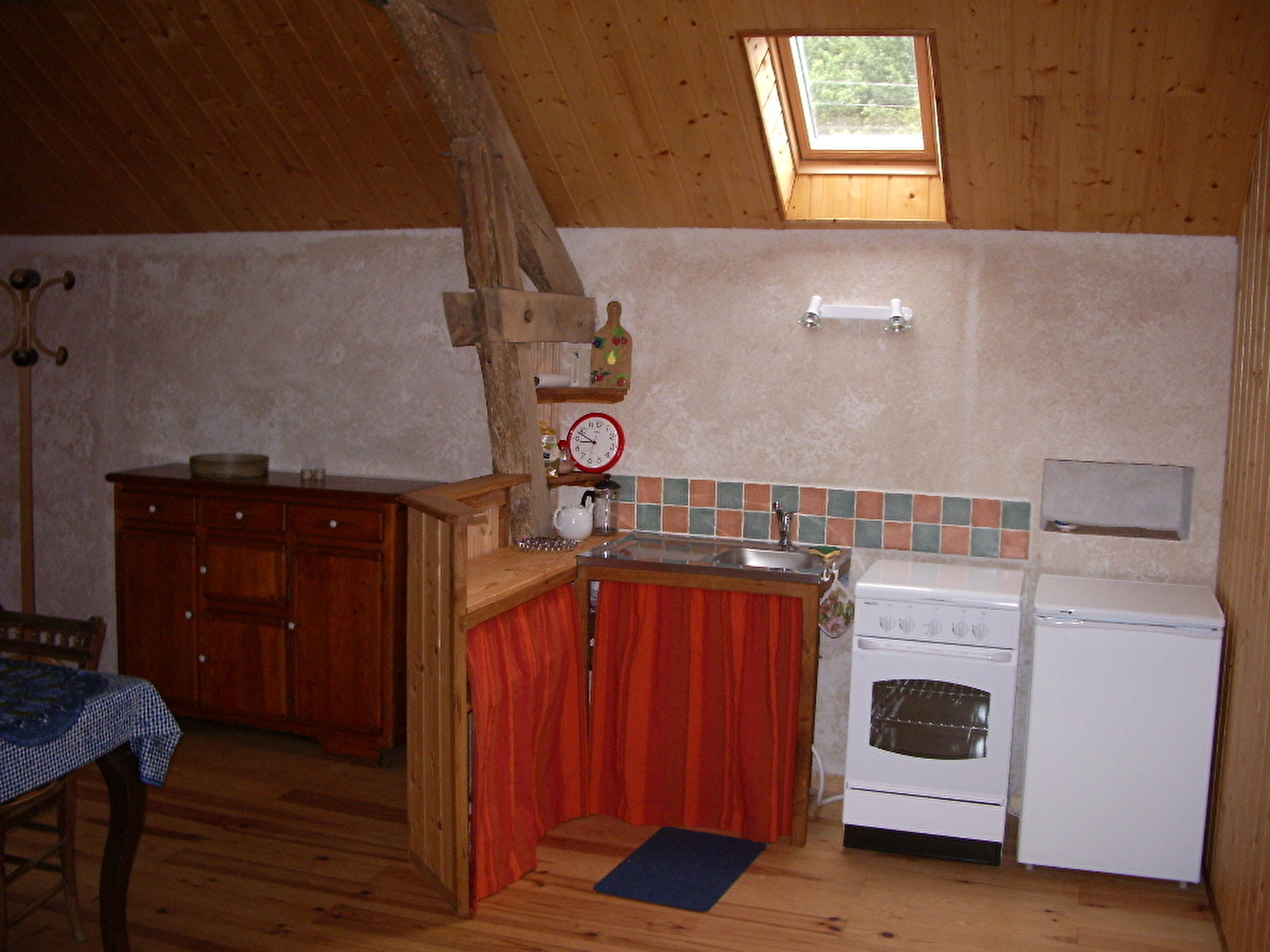 Le gîte est une vaste pièce unique ( 40m² ), comprenant un coin couchage, lit en 160, un espace cuisine, un coin salon avec en plus un lit simple, un espace fermé salle de bain : lavabo, douche, wc .