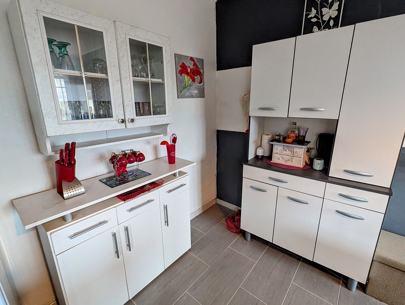– Bouilloire, cafetière, grille-pain et ustensiles de cuisine.