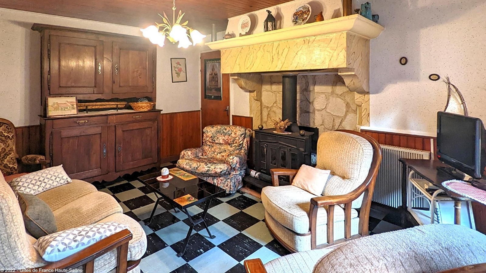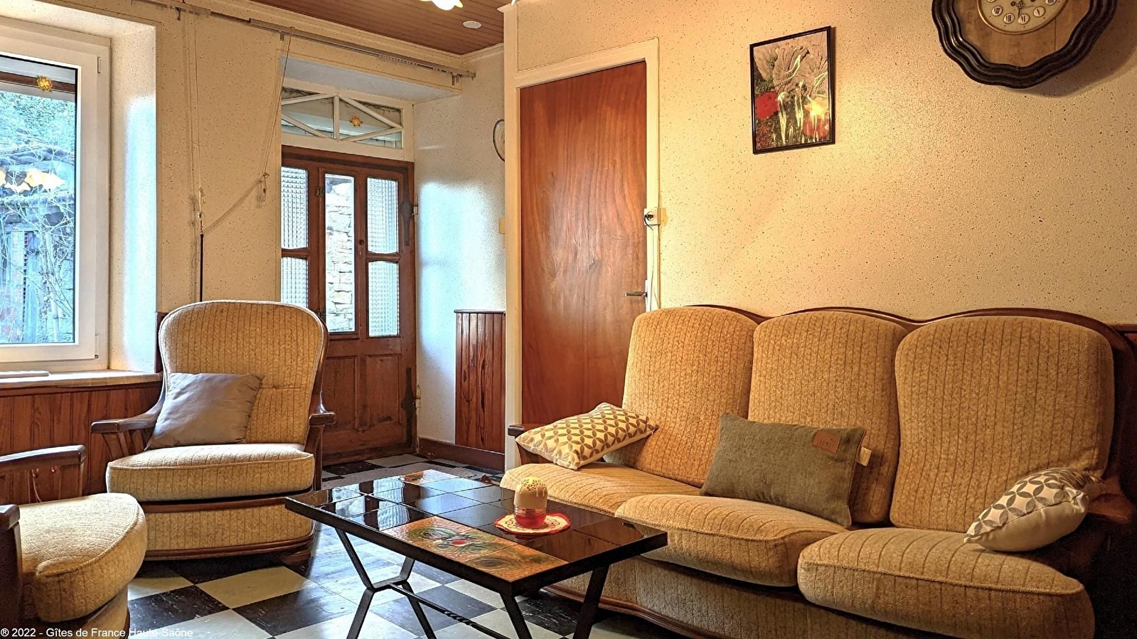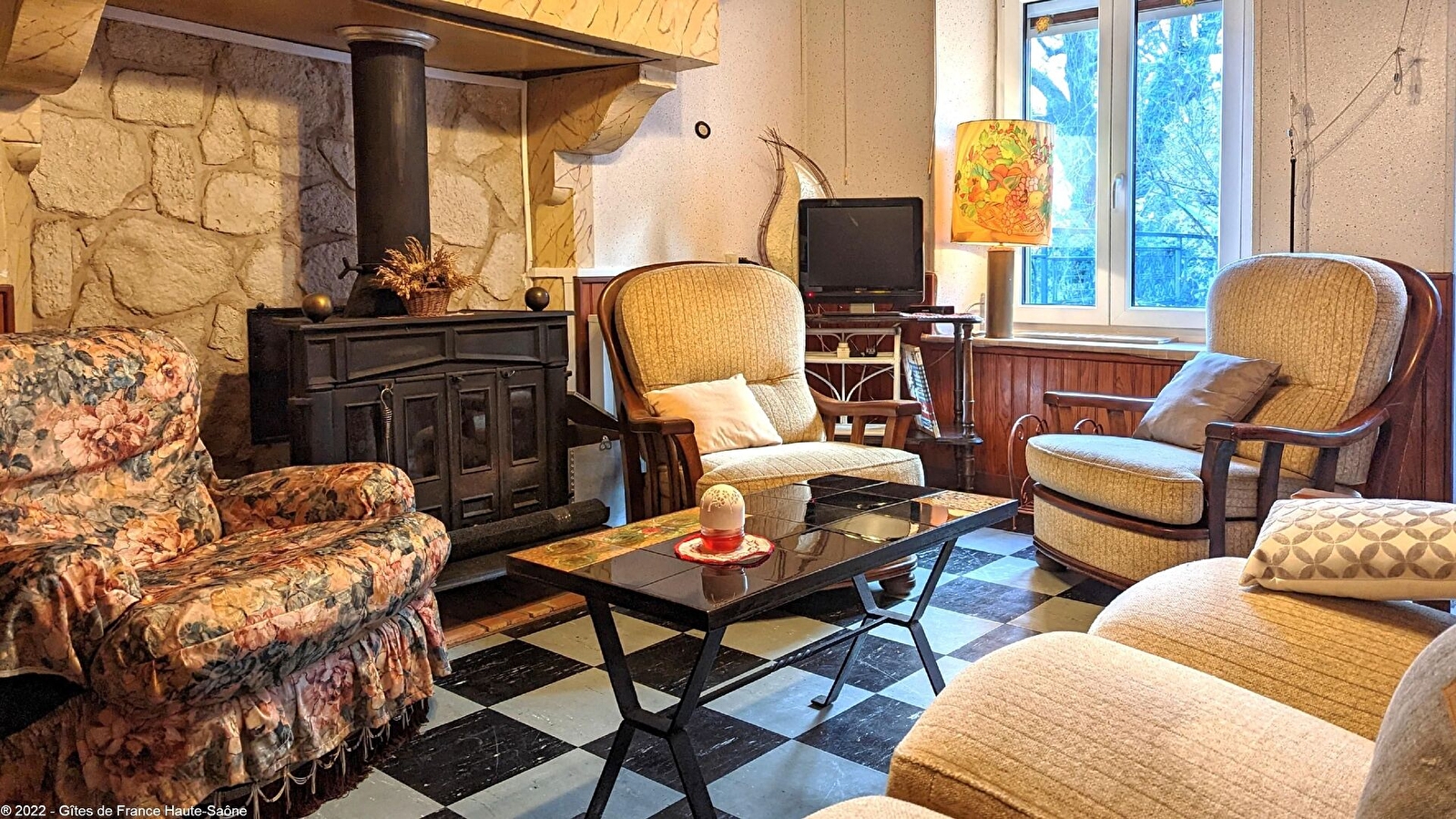 À l’étage, le salon est doté d’une cheminée (bois fourni). Une chambre avec un lit 140x190 donne accès à une terrasse supérieure reliée directement à la rue.