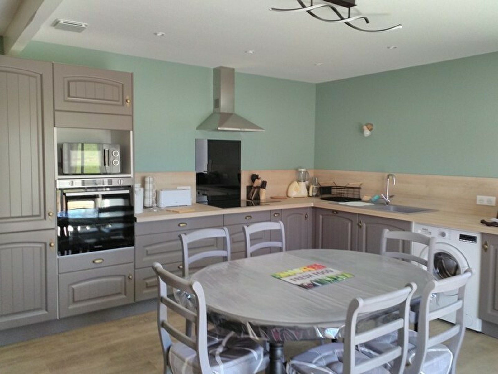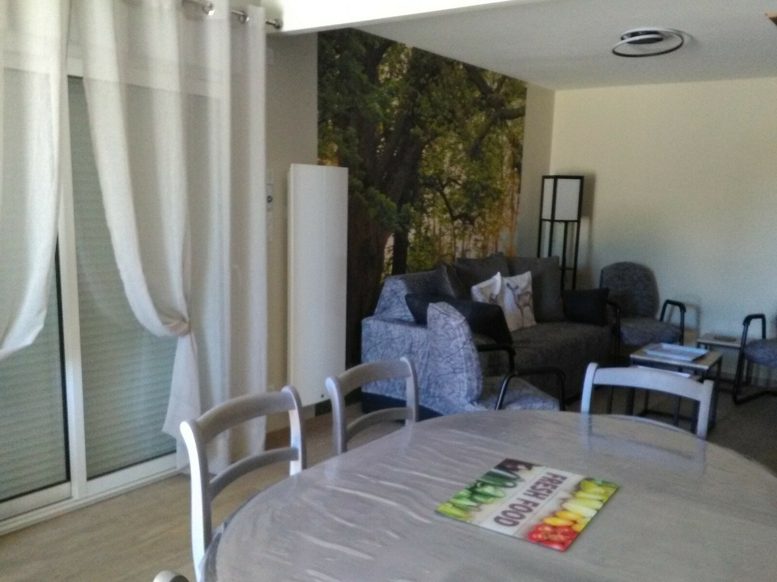 • une salle de vie avec coin salon et, face à la baie vitrée, espace repas (avec cuisine parfaitement équipée : lave-vaisselle, lave-linge, plaque de cuisson, four,