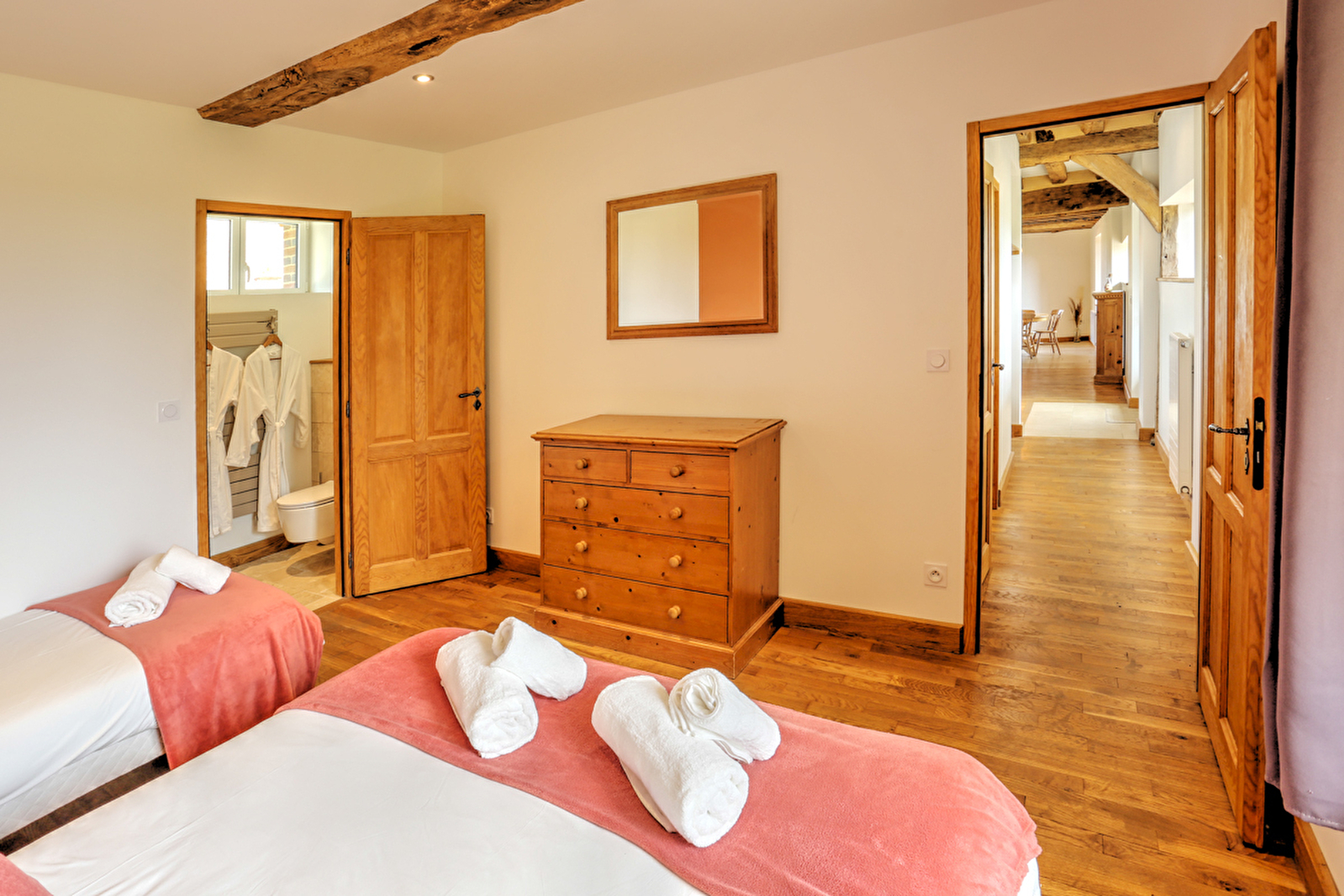 Le couloir dessert un toilette puis deux chambres .