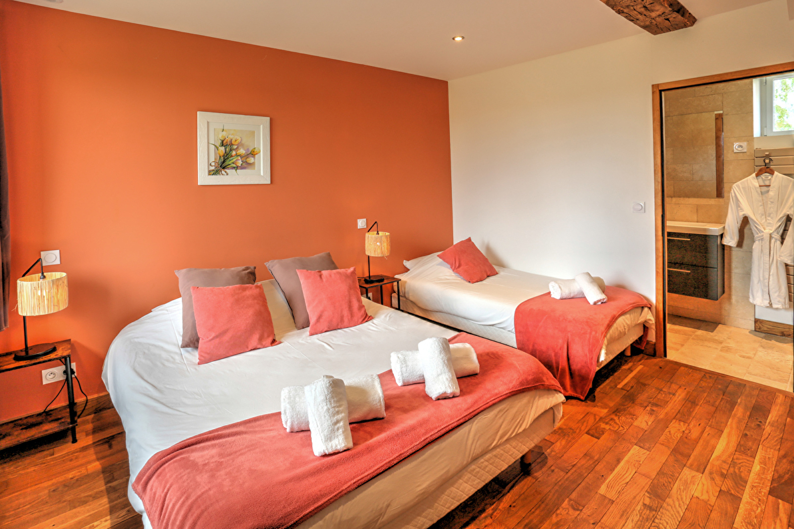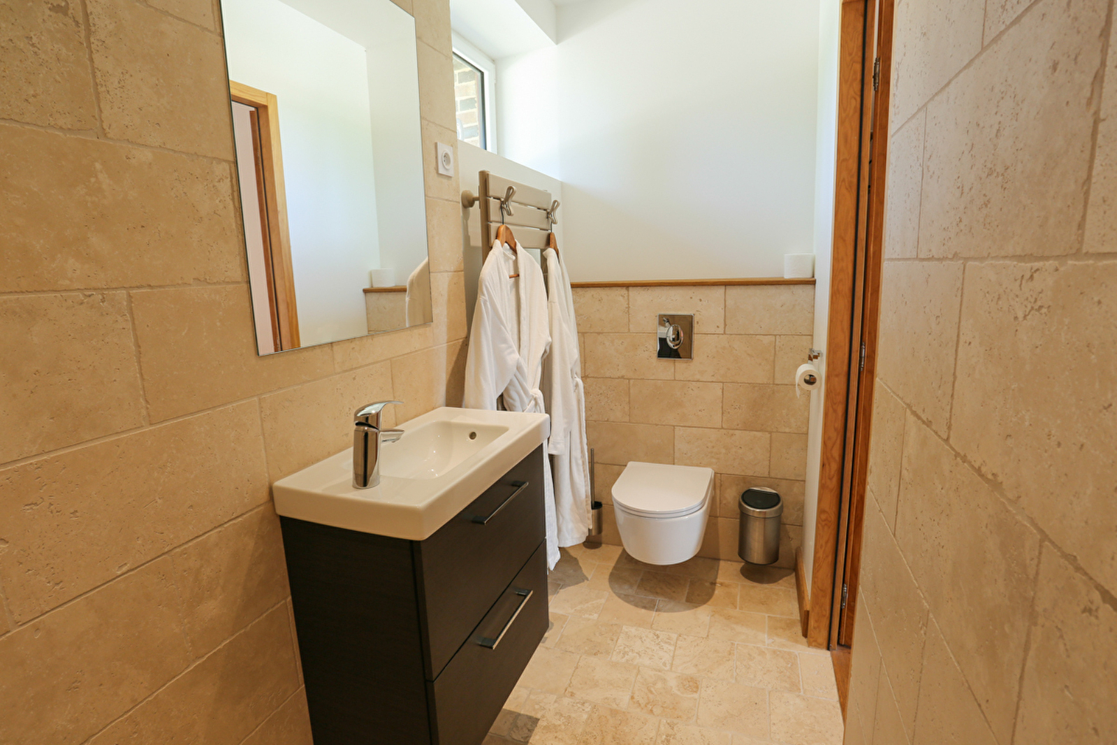 Quand à la seconde chambre plus grande avec un lit double de 160x200cm et un lit simple elle possède également sa salle de bain ( douche à l’italienne en pierres naturelles) et ses propre toilettes.