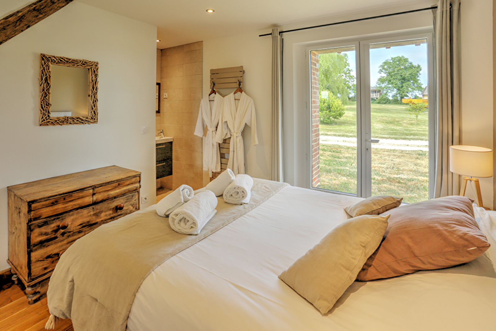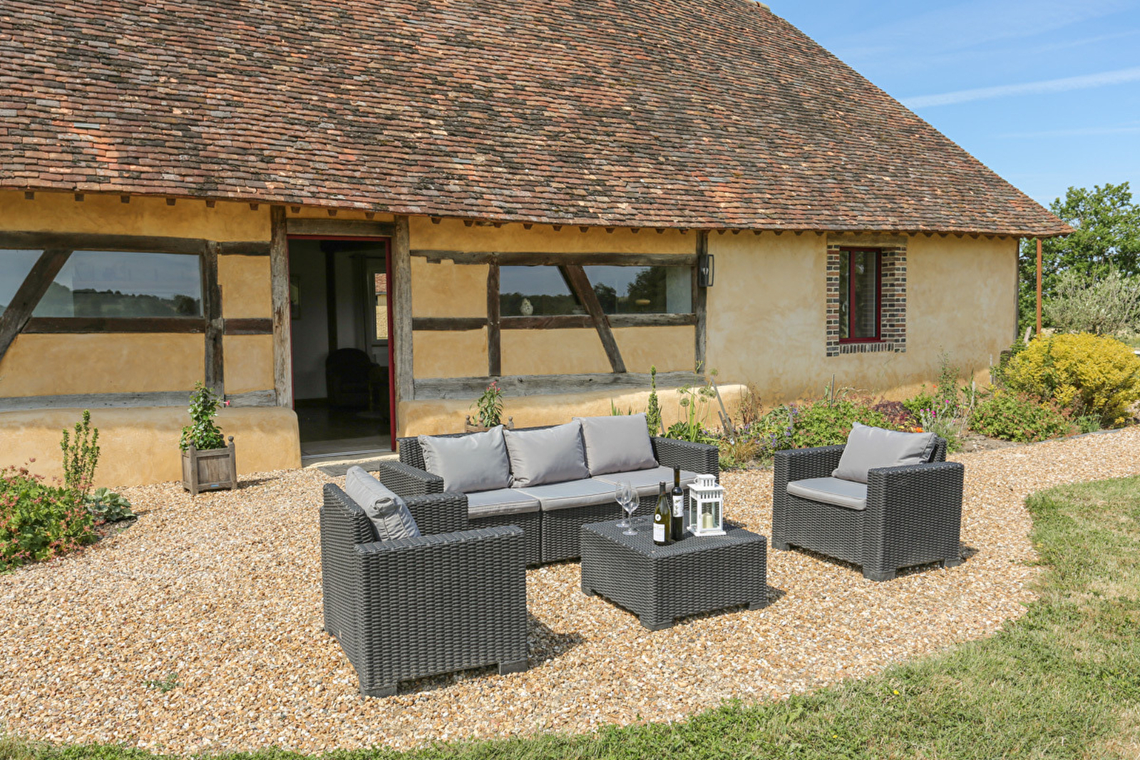 Vous pourrez profiter du Jardin avec vue dégagée sur la campagne poyaudine et la terrasse avec son spa à accès libre , et une table en teck pour vos déjeuners et repas.