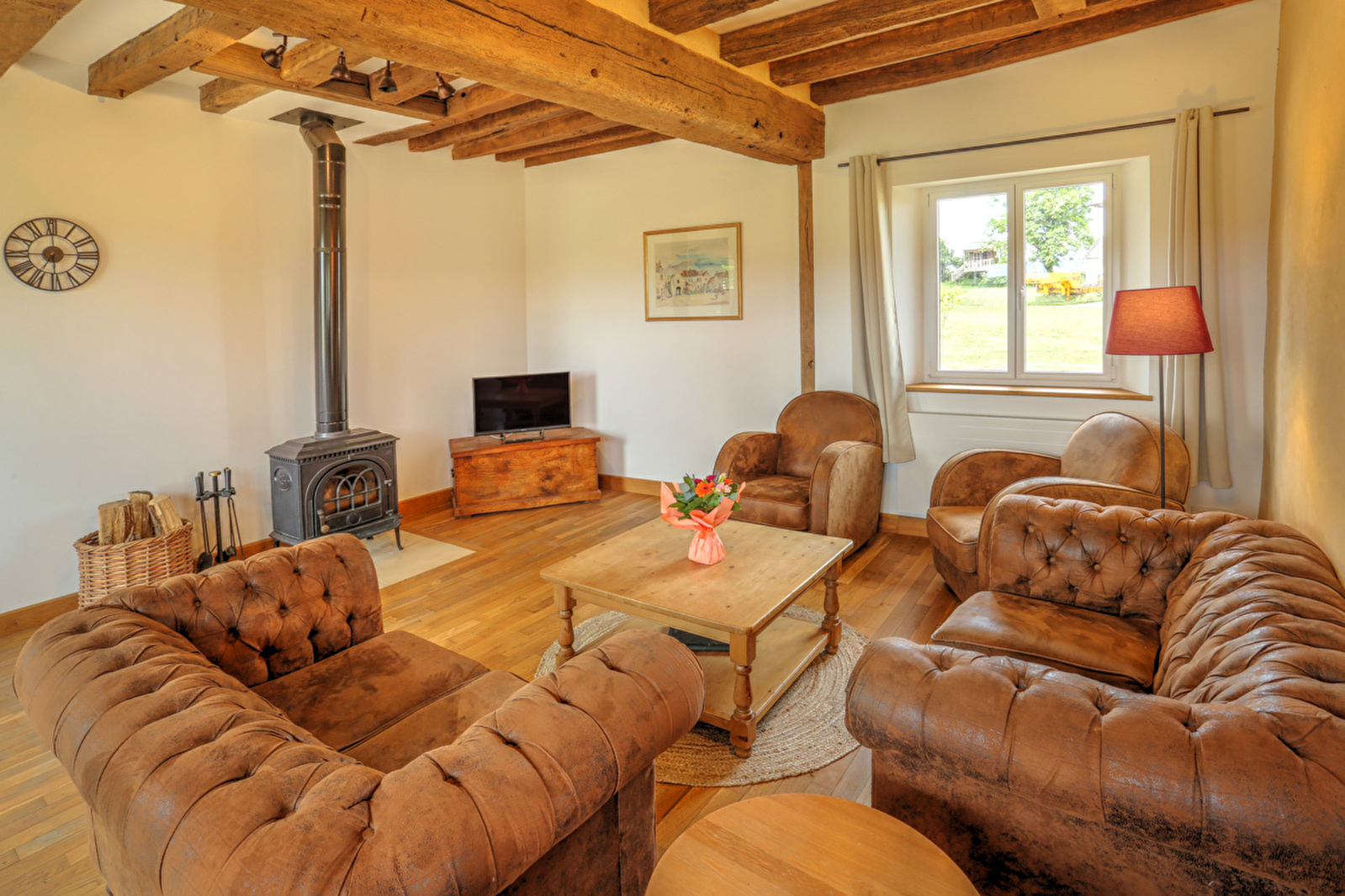 Le gîte possède une grande pièce de vie avec un poêle à bois et une magnifique vue sur la campagne environnante. La cuisine aménagé toute équipée ( piano de cuisson ), ouverte sur la salle à manger et le salon sera idéal pour préparer le petit déjeuner ou le repas qui pourront être pris sur la terrasse extérieur accessible directement par une baie à galandage .