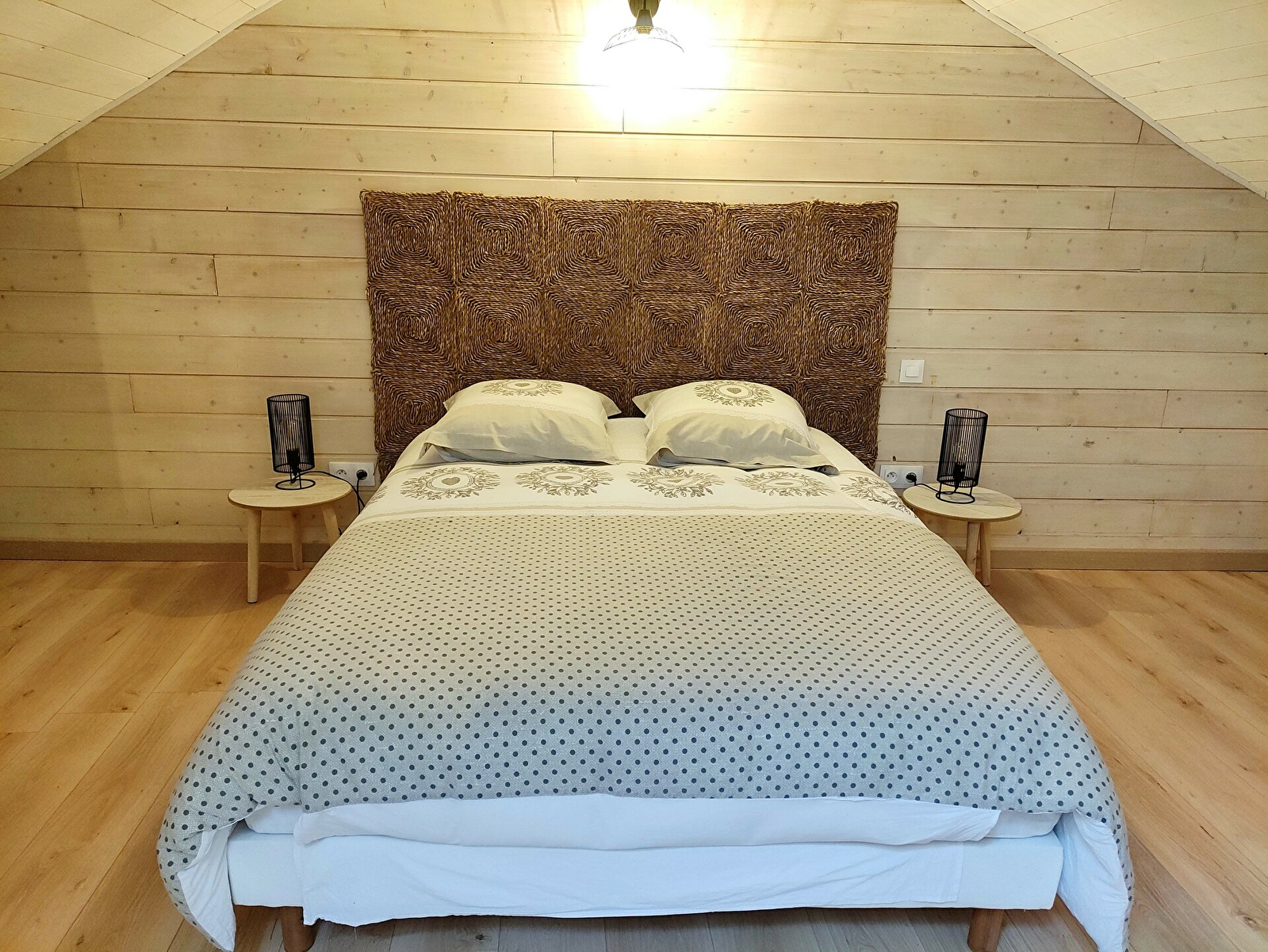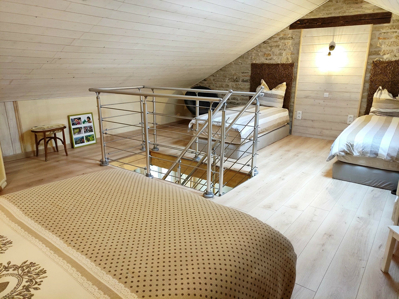 A l’étage : Grande chambre de 30m² pour 4 personnes (1 lit pour 2 personnes, 2 lits pour une personne et un lit bébé).