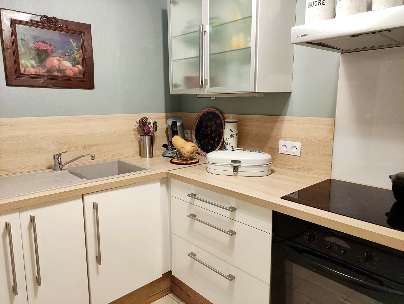 D’une cuisine équipée (à l’exception du lave-vaisselle) ouverte sur la salle à manger/salon, téléviseur, canapé et wifi,