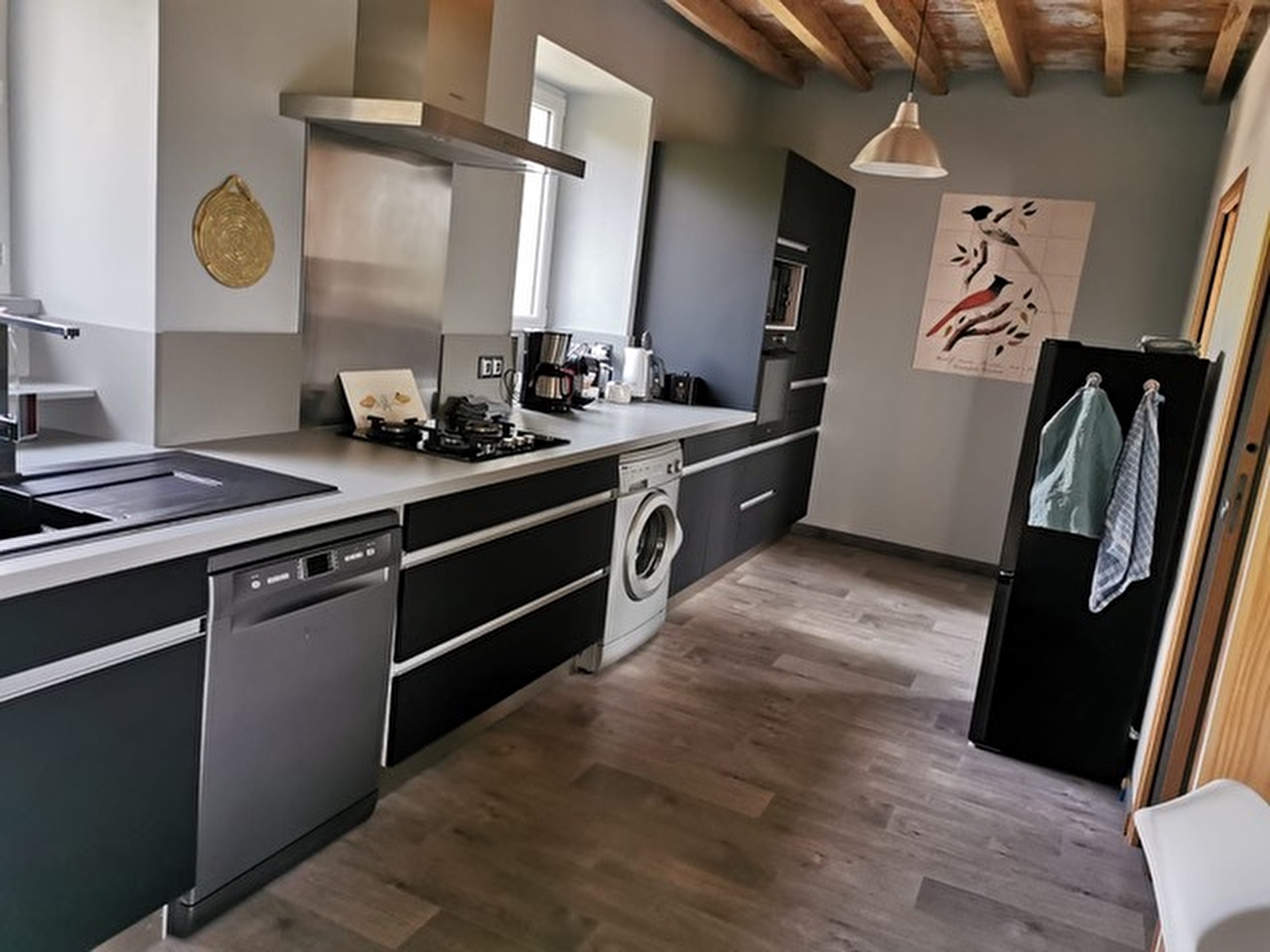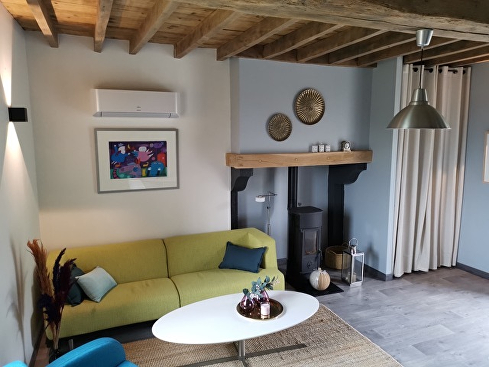 Au rez-de-chaussée, vous trouverez une cuisine moderne et bien équipée, une salle de bain avec douche à l’italienne et douche pluie et le salon confortable avec poêle à bois et coin repas. A l’étage, équipé de climatisation et de Wifi, se trouve le lit double réglable électriquement (160×200) et le canapé-lit (140×200).