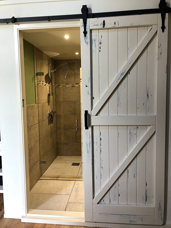 Salle de bain : douche, toilettes et lavabo avec miroir. Un sèche-cheveux est à disposition.