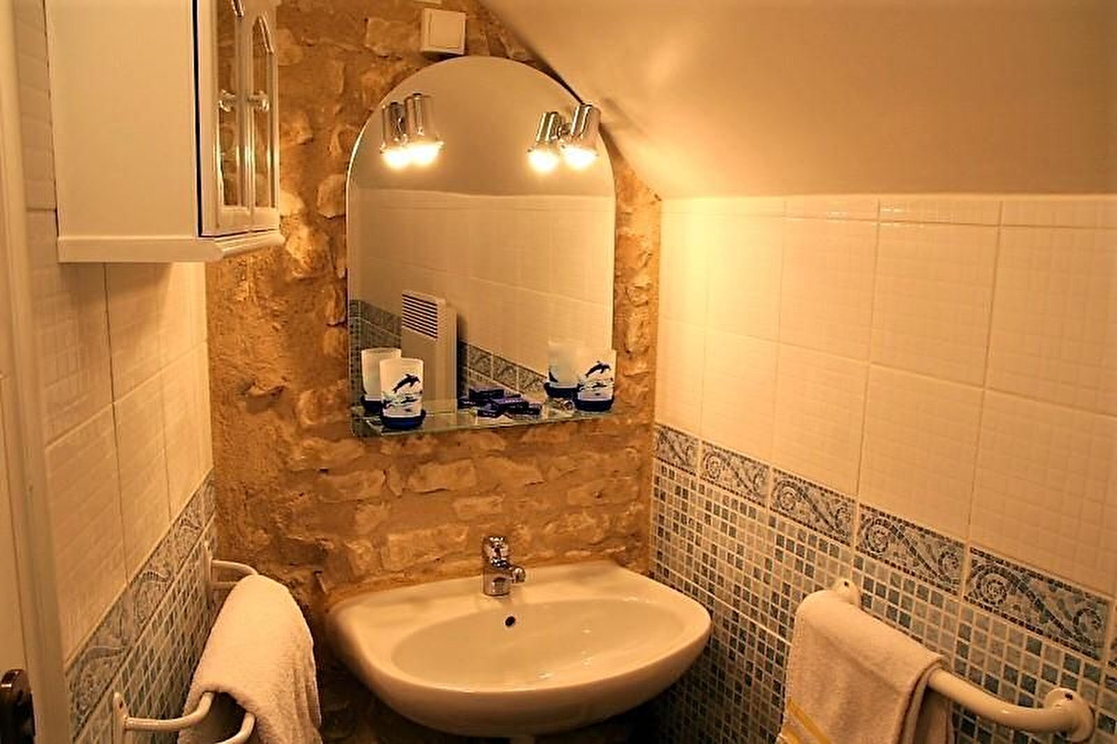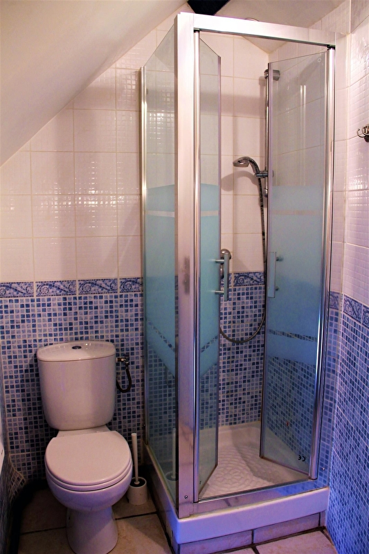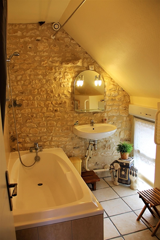 A l'étage, 2 chambres de 2 pers (4 lits simples pouvant être jumelés en grand lit double, 160x190) et deux (2) salles de bains (douche et baignoire) avec WC. Un autre WC indépendant au rez-de-chaussée.