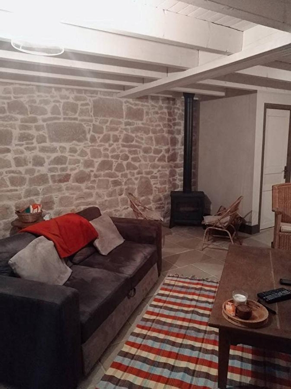 Dans le séjour aux poutres apparentes et murs en pierres, un poêle à bois procure une douce chaleur et apporte une ambiance douillette.
