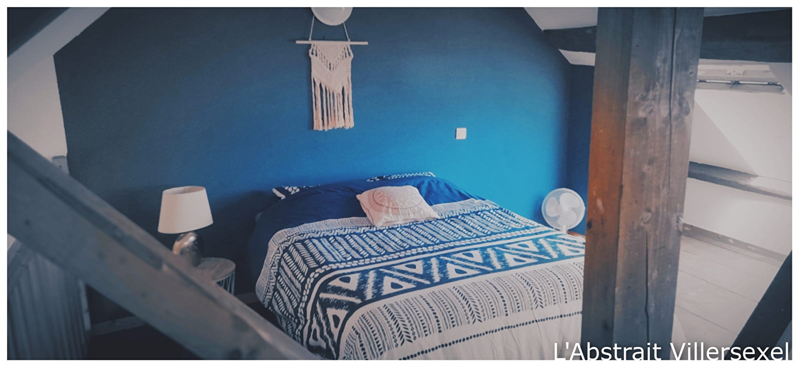Ce logement atypique comprend une cuisine ouverte sur le salon, une chambre mezzanine et une salle de bain.
