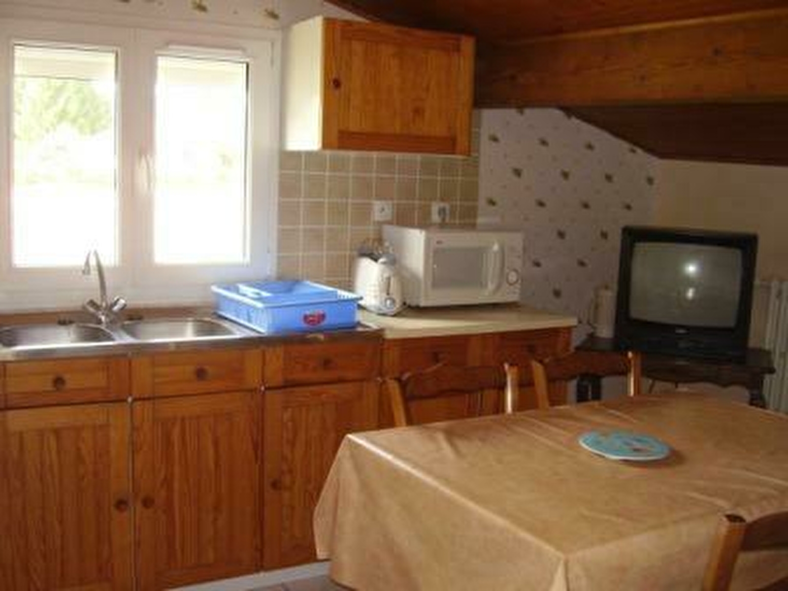 Appartement à l'étage de la maison des propriétaires. Entrée indépendante. Balcon,hall d'entrée. Cuisine avec, frigo-congélateur, micro-ondes, TV. 1 chambre avec banquette et 1 lit de 140, 1 chambre avec 1 lit de 120 et 1 lit de 90 avec lavabo, Salle d'eau avec lave-linge et WC. Jardin clos, salon de jardin barbecue. Près du Port de la Saisse.