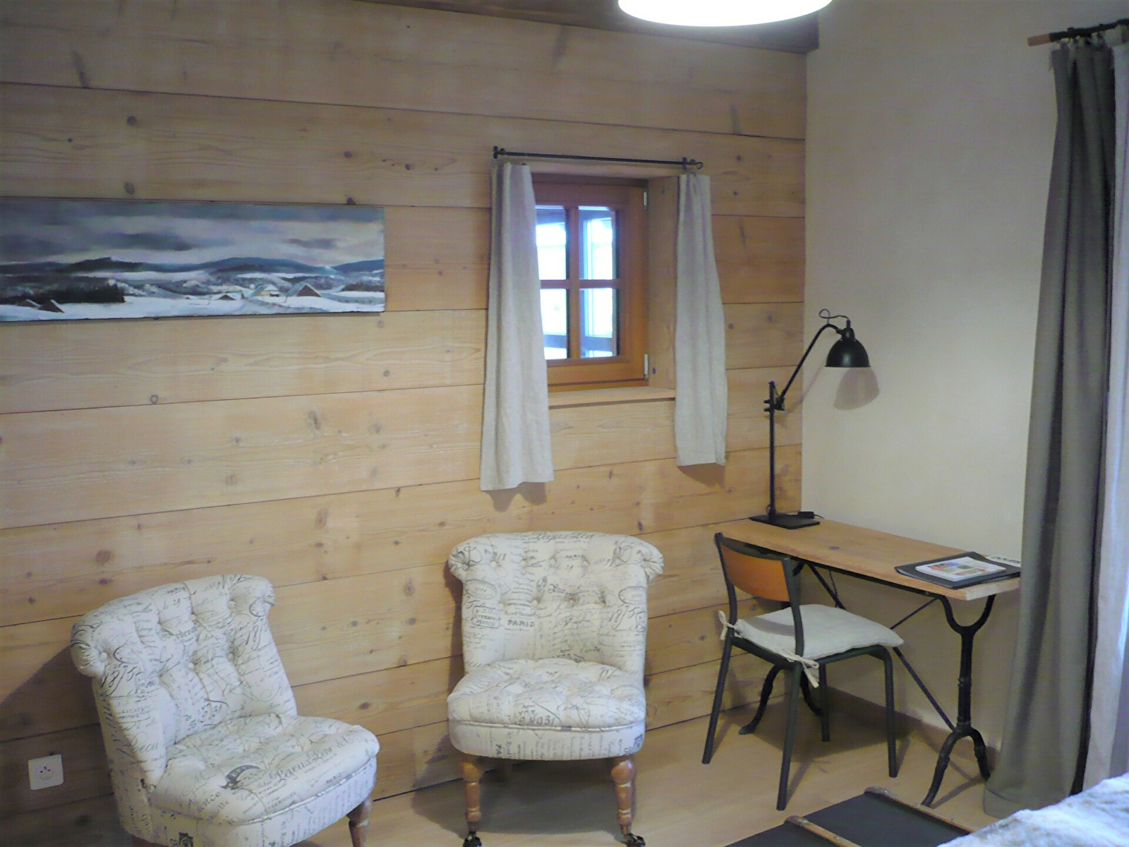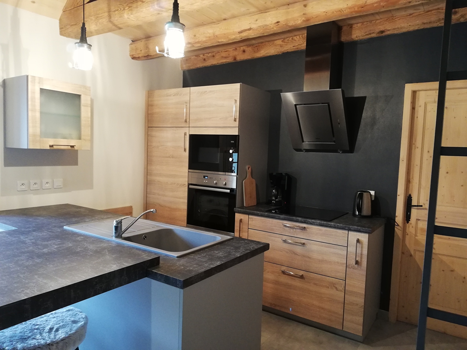 De beaux volumes pour la pièce à vivre (avec cuisine toute équipée) où la pierre et le bois sont mis à l'honneur, et 2 belles chambres avec chacune leur salle d'eau et WC privatifs. Ce gîte conviendra aussi bien à une famille qu'à 2 couples.