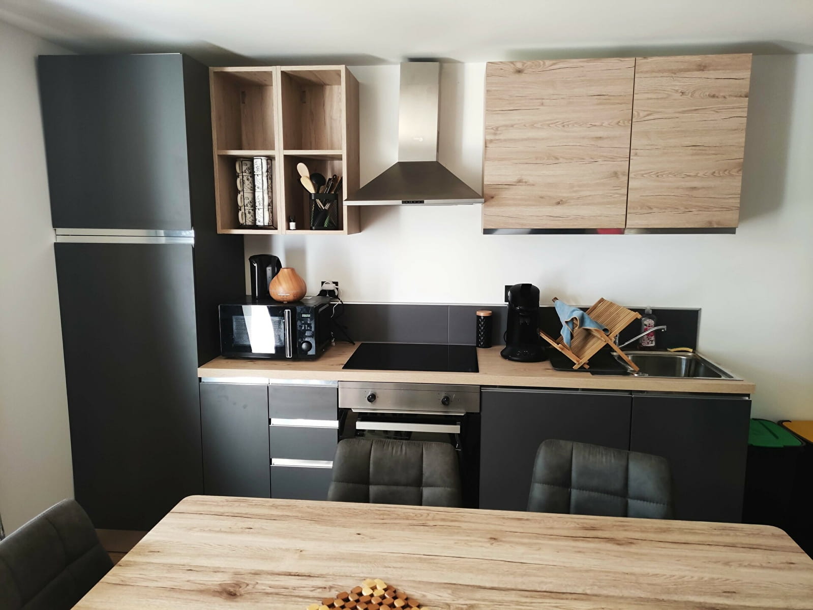 Cuisine équipée : four micro-onde, lave vaisselle, lave linge, cafetière Senséo.
