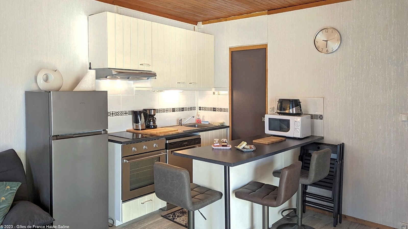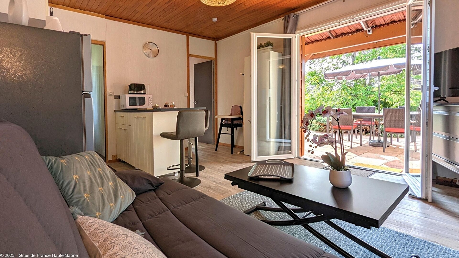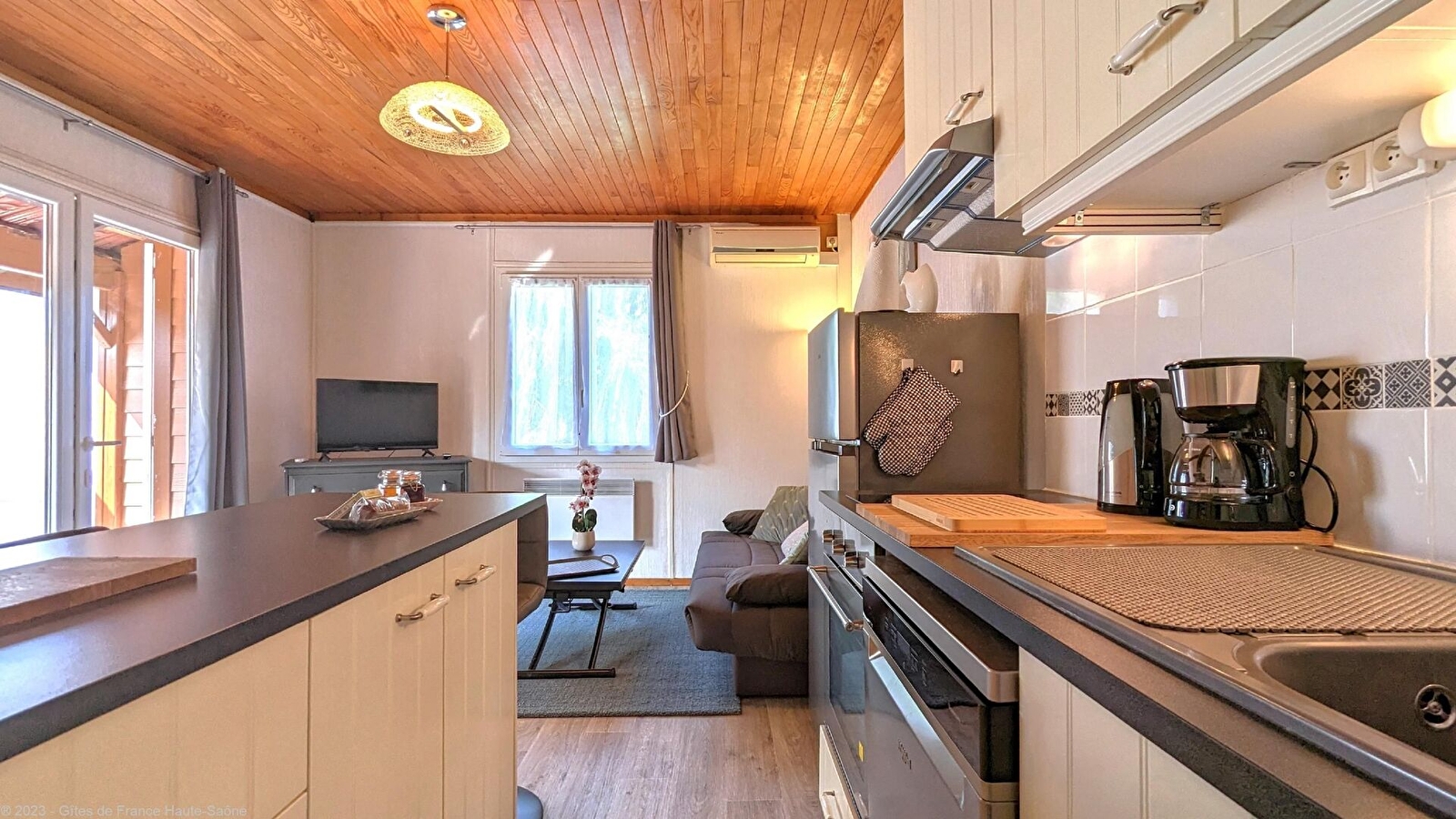 Le chalet de 42m² est composé d'une cuisine ouverte sur le séjour avec une table/bar ou une table basse qui se réhausse pour le repas. Télévision dans le séjour. Salle d'eau avec douche et WC. Chambre avec un lit 2 personnes (160 x 200cm) et une seconde télévision. Le chalet peut être climatisé bien qu'il soit naturellement bien isolé. Terrasse privative avec salon de jardin et bains de soleil. Un barbecue est mis à disposition. Descriptif pour de nombreuses randonnées pédestres. Parking privé fermé.
