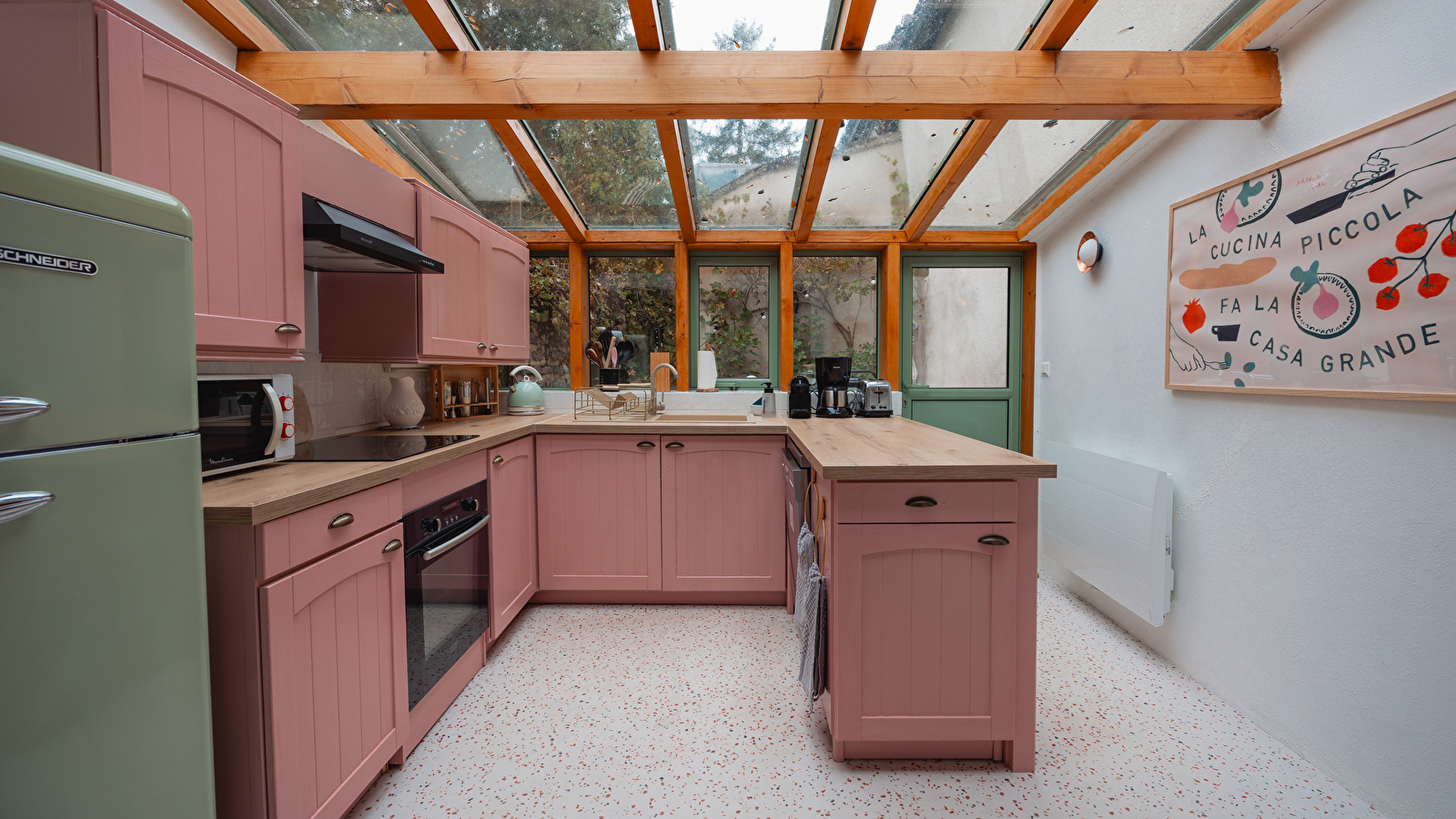 Il est composé de 2 chambres avec vue sur les vignes (une avec un grand lit double et une avec deux lits simples pouvant être réunis), une salle de bain, une cuisine équipée sous une véranda très lumineuse et un salon cosy avec poêle à bois.