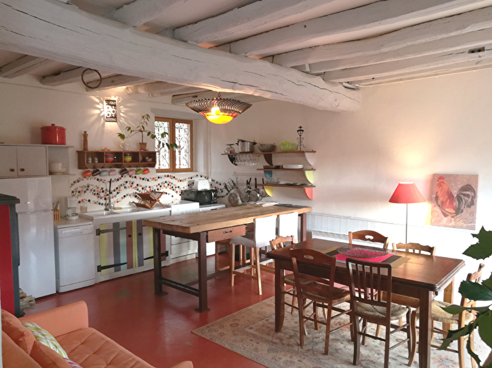 Au rez-de-chaussée: cuisine équipée (gazinière, lave-vaisselle, lave-linge), salle à manger, deux salles de bain, une grande chambre avec lit double et lits superposés