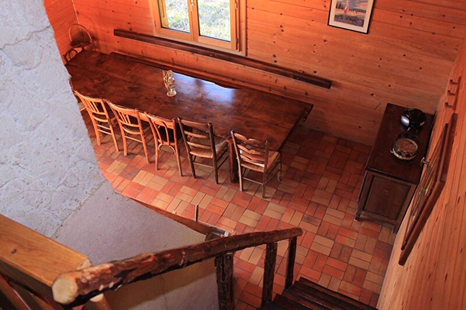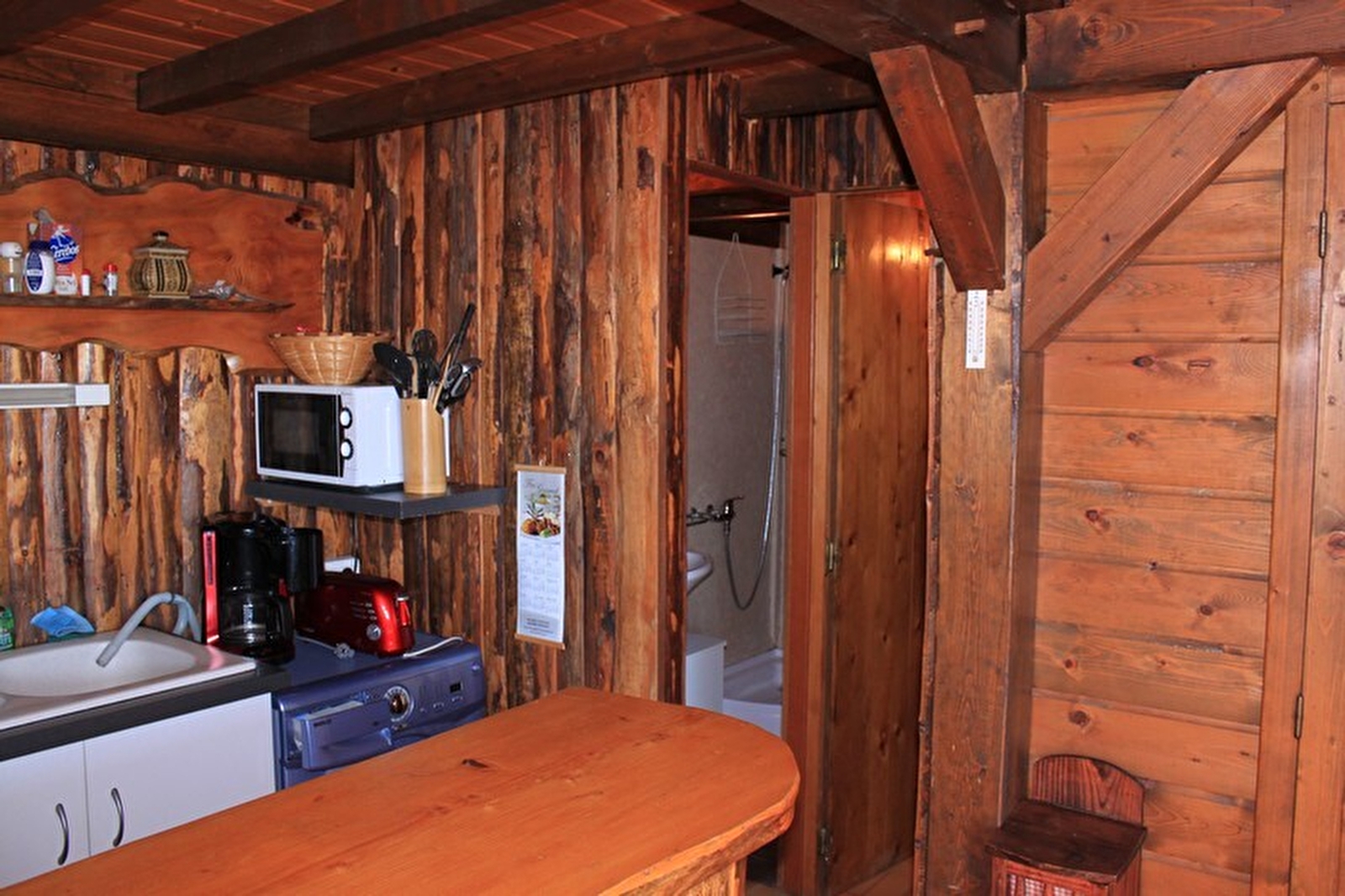 Chalet indépendant. Cuisine, séjour, salon. A l'étage: mezzanine 1 lit 2 pl, 2 lits 1 pl, salle d'eau, ch1: 1 lit 2 pl, terrain attenant non clos, salon de jardin, barbecue. Chauffage électrique. Charges non comprises. Possibilité d'accueillir une 5ème personne sur demande.