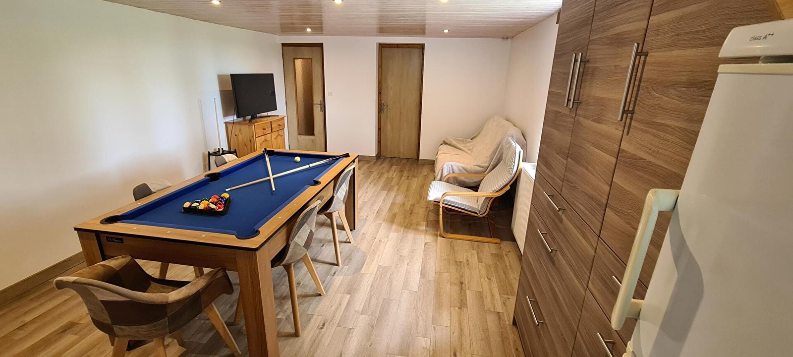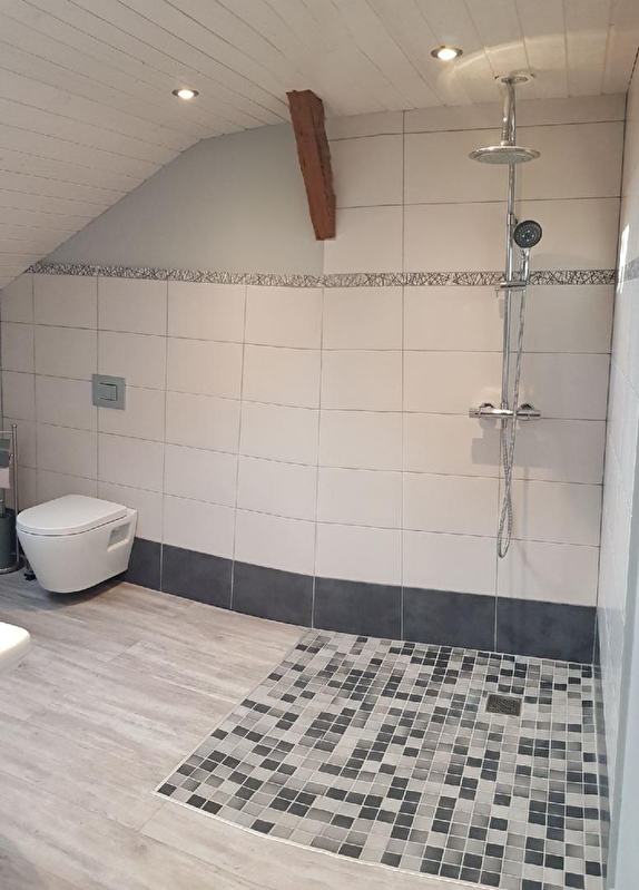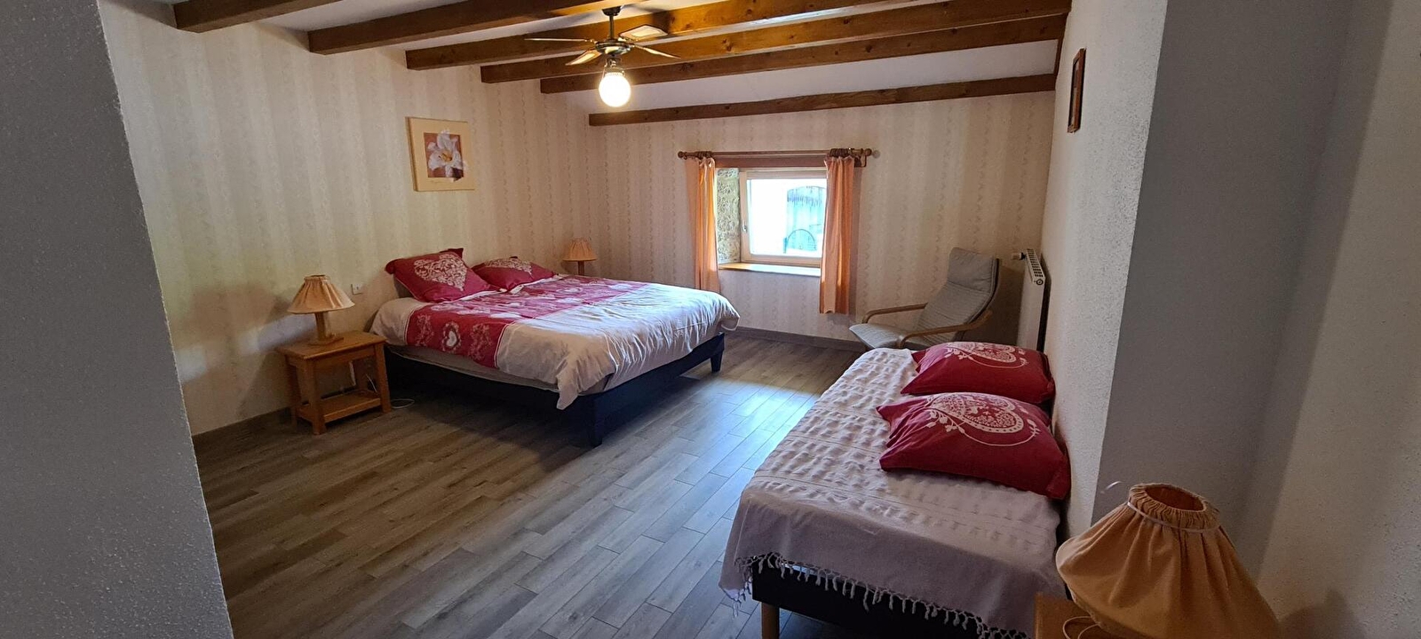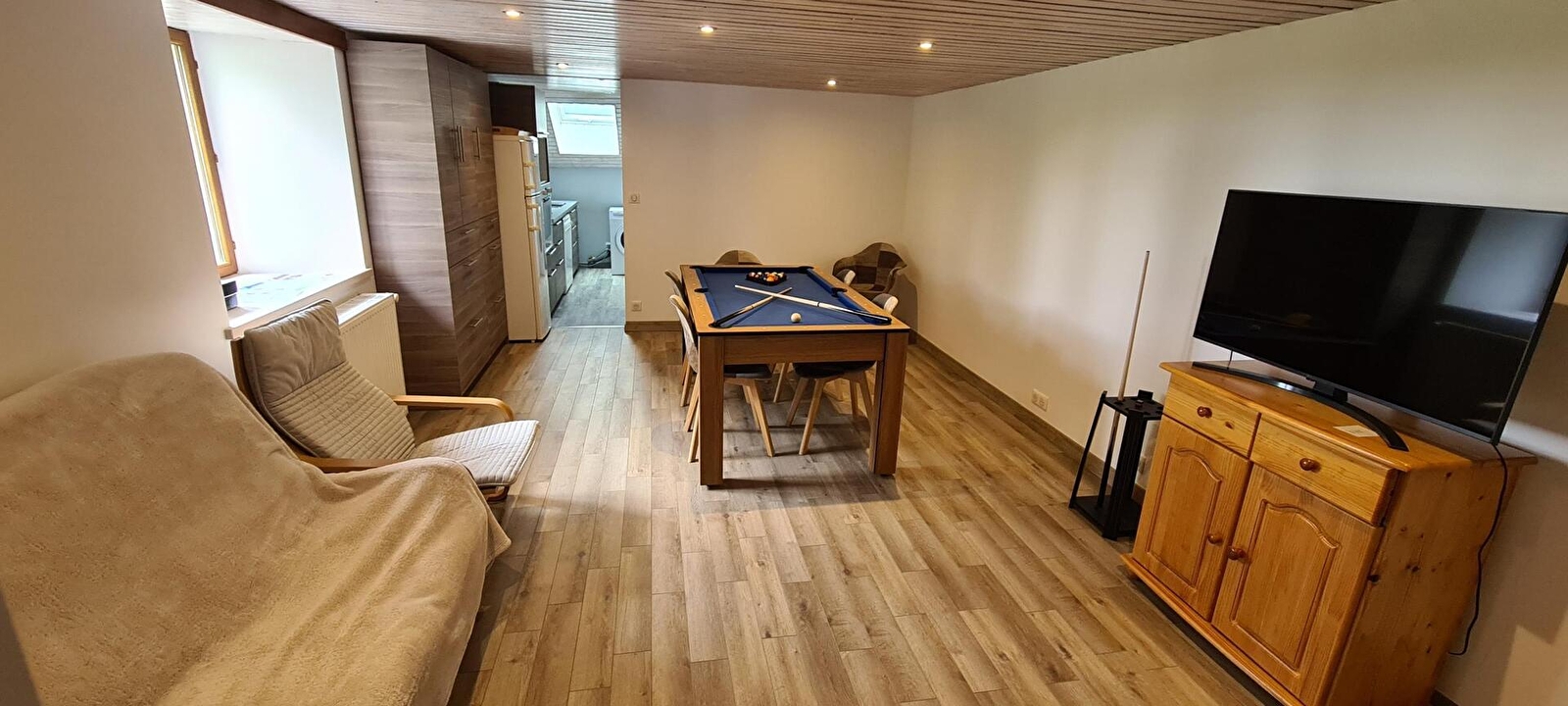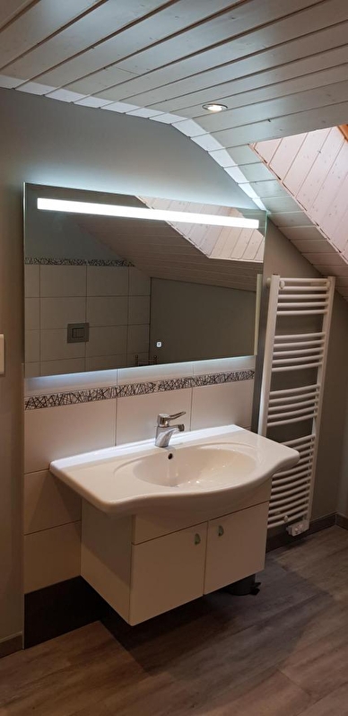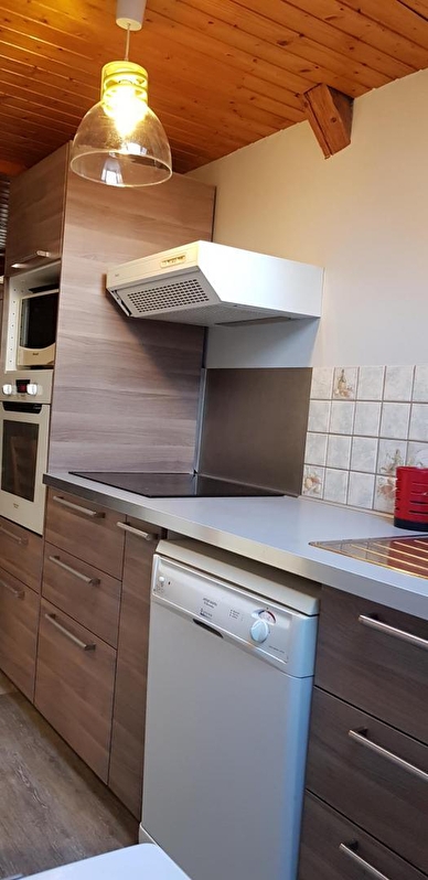 Logement situé à l'étage de la maison du propriétaire avec entrée commune. Une 1ère chambre est située sur la palier avec 1 lit 2 places et 1 lit 1 place. Pièce à vivre avec séjour/salle à manger, coin cuisine (congélateur), une 2ème chambre avec 1 lit 2 places et 1 lit 1 place. Salle d'eau (douche et wc). Terrasse avec barbecue, salon de jardin et piscine commune (ouverte de début mai à fin octobre). Chauffage central. Toutes charges comprises. Un seul animal accepté qui ne sera pas laissés dans le gîte en l'absence de ses maîtres. Terrain de pétanque partagé. Borne de recharge électrique (11kwh) à disposition sur place.