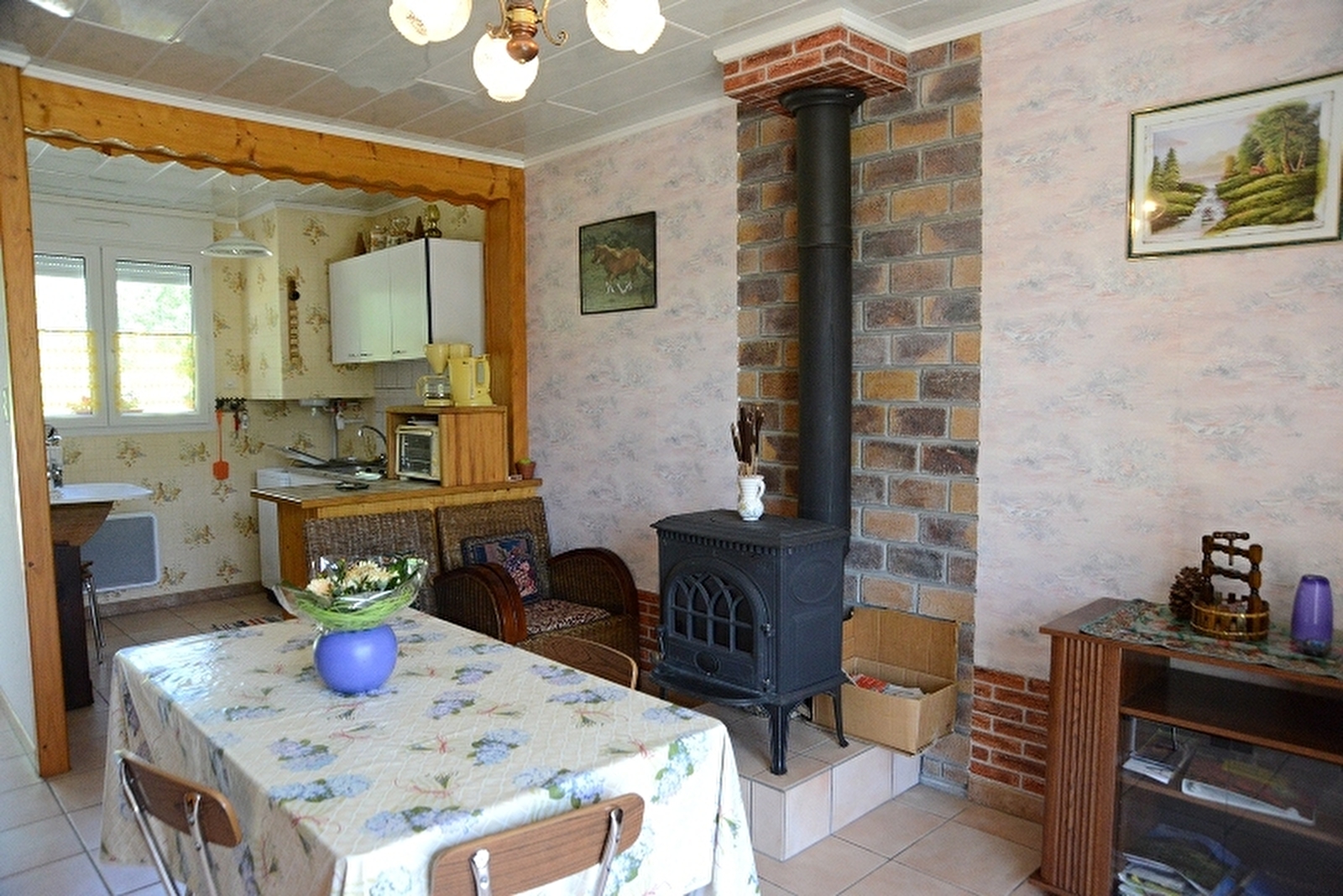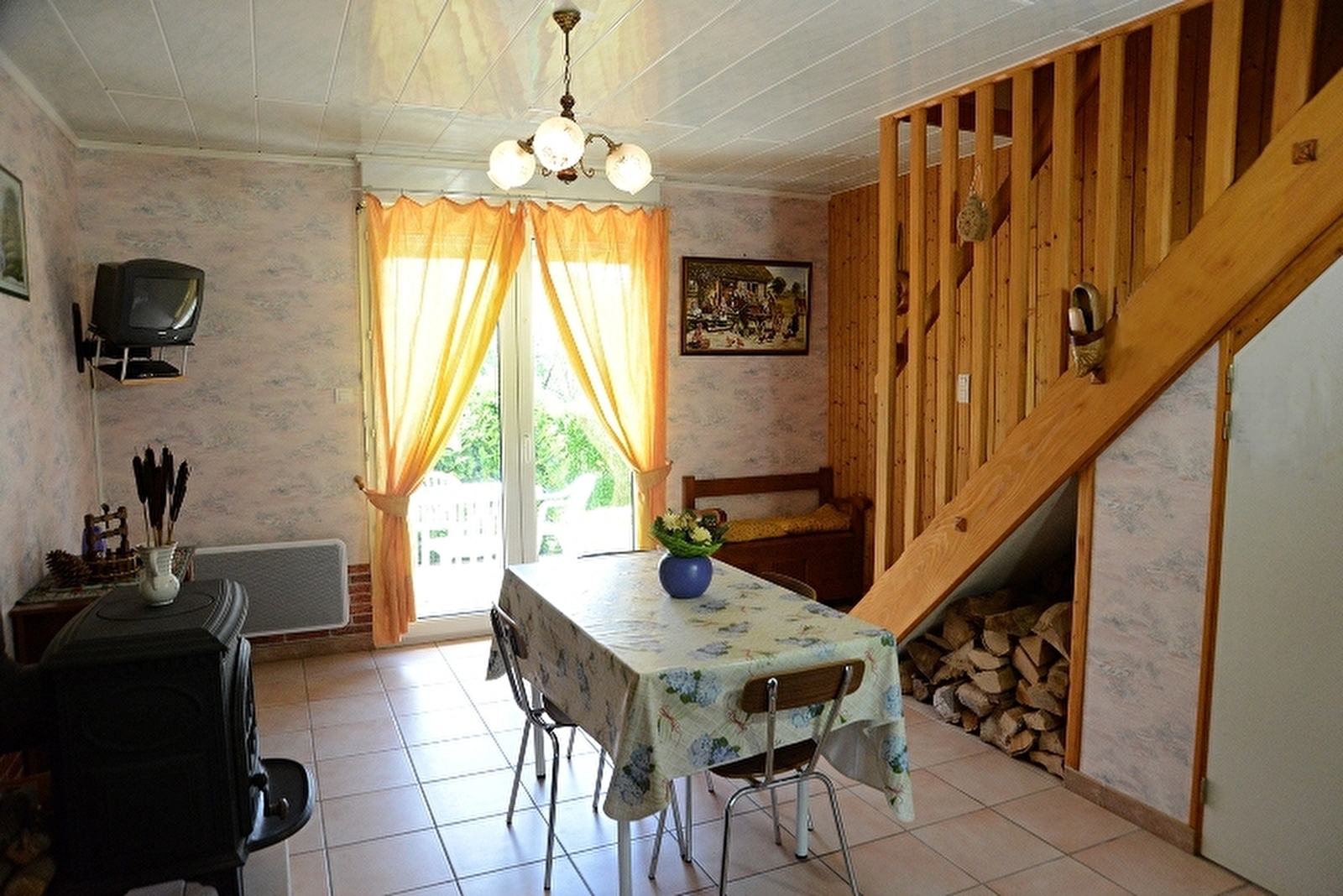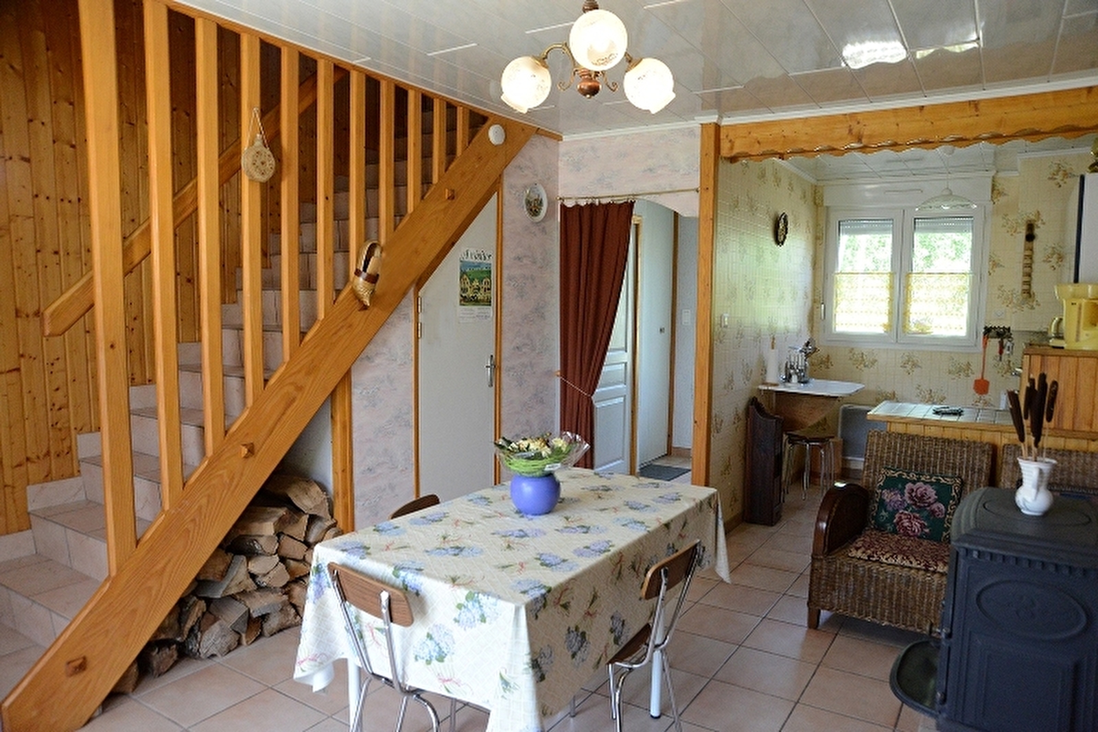 Logement dans une maison de construction récente abritant d'autres appartements. RDC: séjour, coin cuisine avec poêle-cheminée, wc. A l'étage: ch1: 1 lit 2 pl, ch2: 2 lits 1 place, salle d'eau. Cour et jardin non clôturé, salon de jardin, barbecue. Chauffage électrique et bois. Charges non comprises. forfait ménage obligatoire si présence d'un animal : 30€