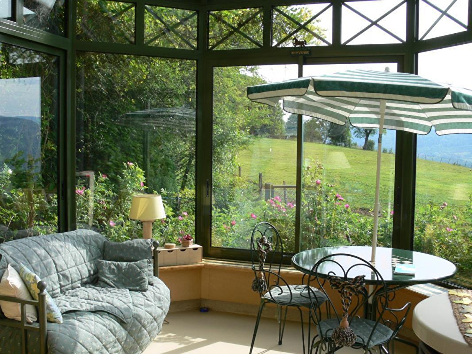 Sur les hauteurs de Lavans les St-Claude, proche de la Suisse entre Lacs et Montagnes, gîte coquettement aménagé mitoyen de la propriétaire, de plain-pied, au milieu d'un grand et beau parc arboré et fleuri, entièrement clos prolongé d'une prairie où paissent Vanille et Cannelle, les 2 ânesses de la famille.Coin-cuisine équipée, séjour, salon (lecteur dvd, radio, TV), un 2ème salon terrasse sous une véranda (poêle à bois) offrant une magnifique vue sur la vallée et les Monts Jura. Une chambre : 1 lit 2 pl, salle de bain avec baignoire et WC. Afin que vous puissiez profiter des lieux dès votre arrivée, et effacer la fatigue du voyage, votre chambre sera prête, et les linges de toilettes seront en place.