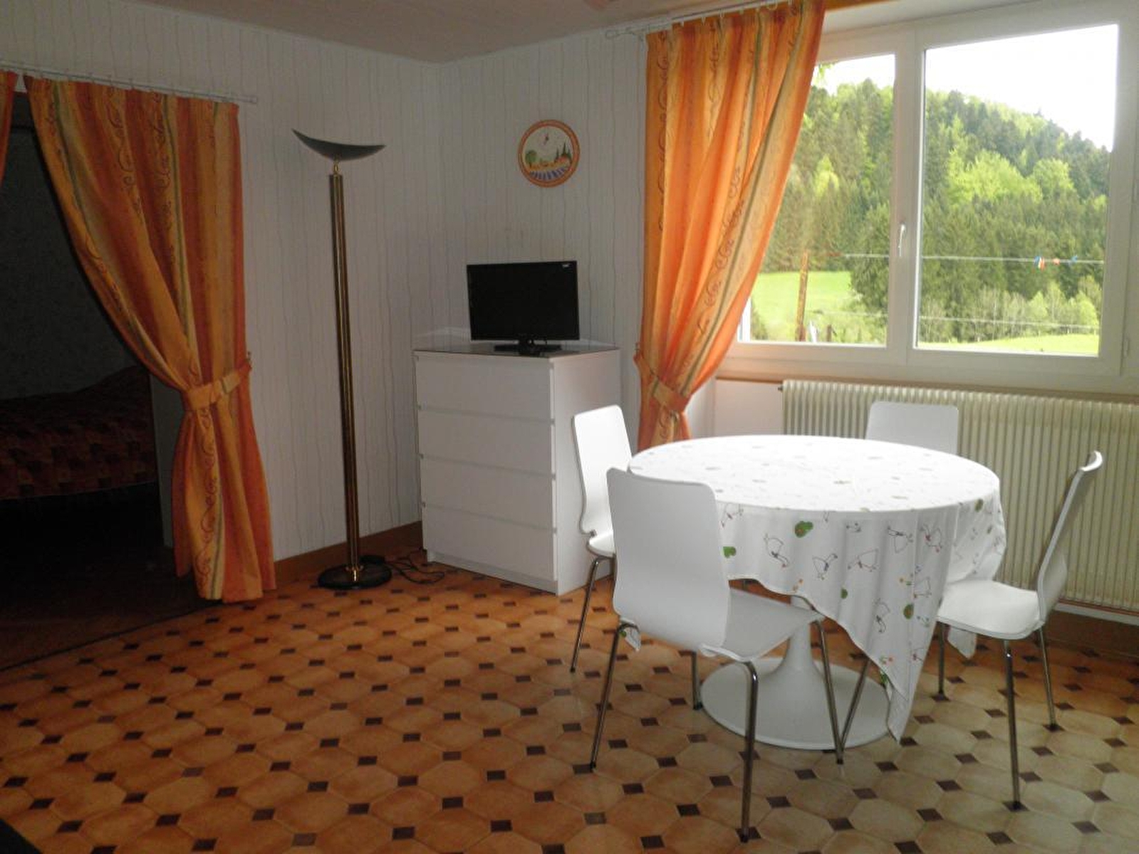 Logement mitoyen de plain pied situé dans le haut-Jura et à quelques kilomètres de la région des Lacs (Cascades du Hérison à 15km). Le gîte est composé d'une cuisine indépendante entièrement équipée, salle d'eau (douche à l'italienne, wc), salon avec espace détente (TV, canapé convertible) et un lit gigogne, chambre composée d'un lit 2 pl. Terrasse avec salon de jardin, barbecue. Les propriétaires seront enchantés de vous faire découvrir les animaux de la ferme. Espace jeux à l'intérieur et à l'extérieur