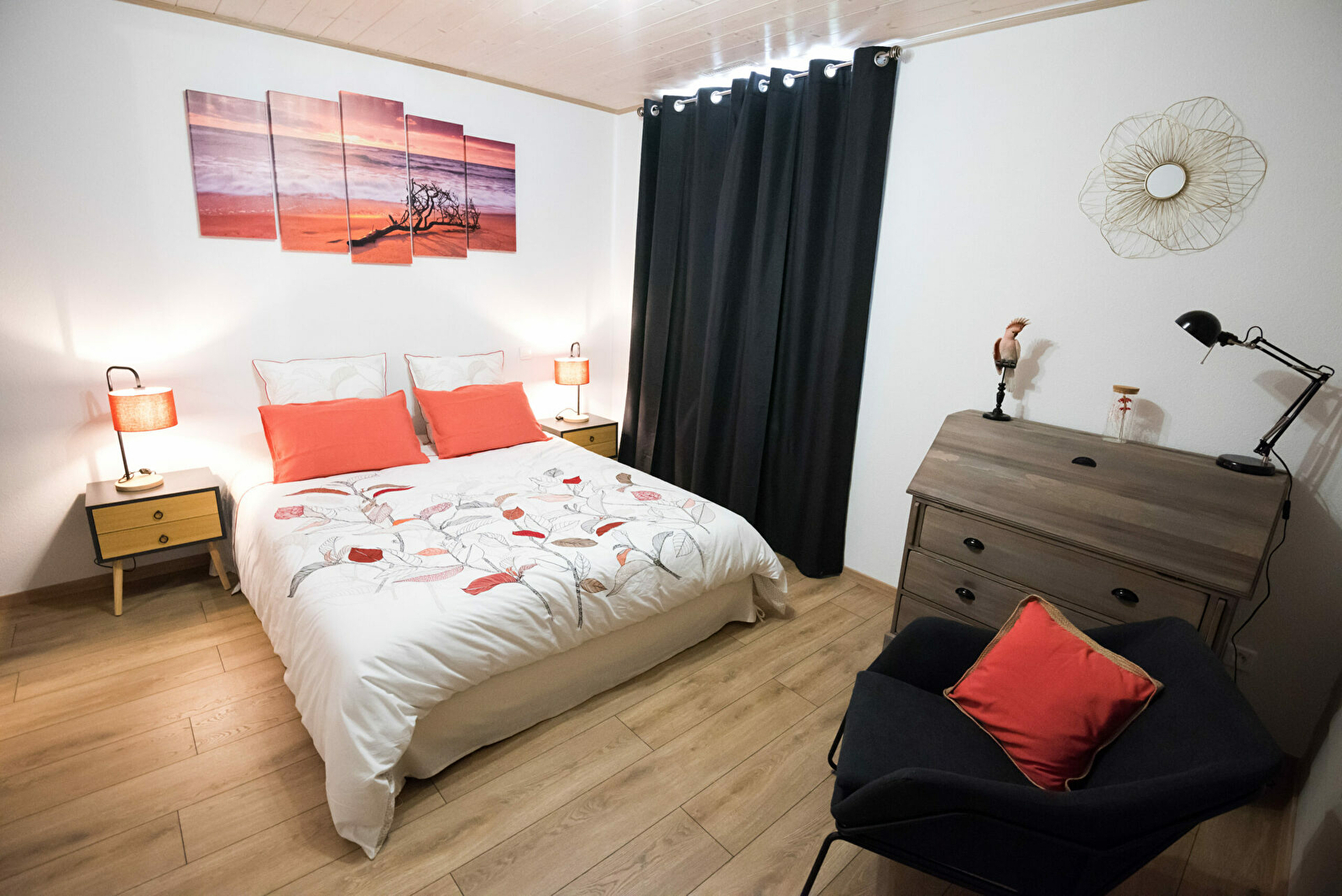 A l’étage, 3 chambres spacieuses et lumineuses ayant chacune une ambiance différente ainsi qu’une grande salle de bain avec douche italienne et toilette. Deux des chambres peuvent accueillir 2 personnes et la dernière 4 personnes.