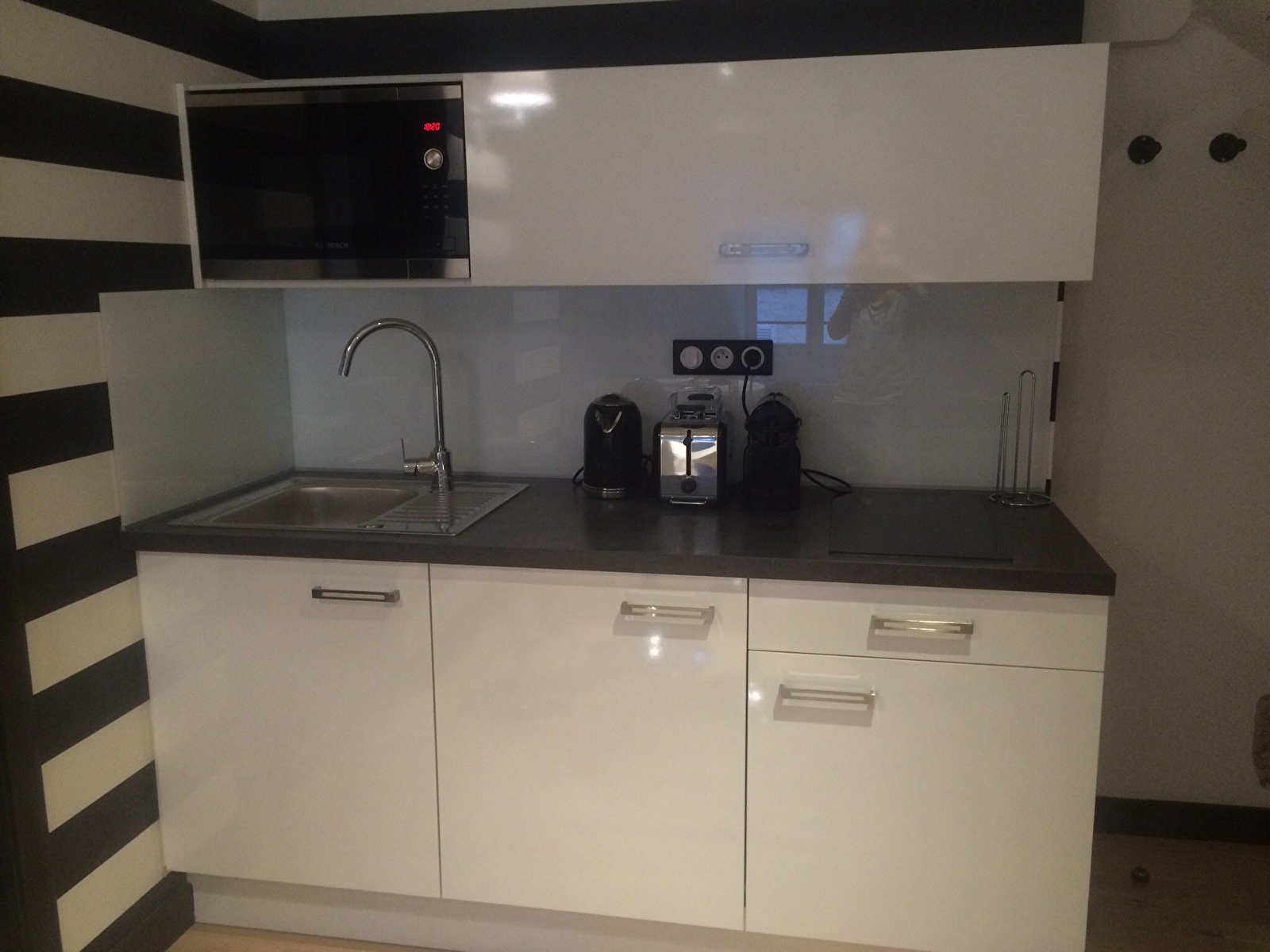 Le coin cuisine est équipée de 2 plaques de cuisson induction, d'un frigidaire, four à micro-onde, machine à café Nespresso (capsules fournies), bouilloire, grille-pain, vaisselle.