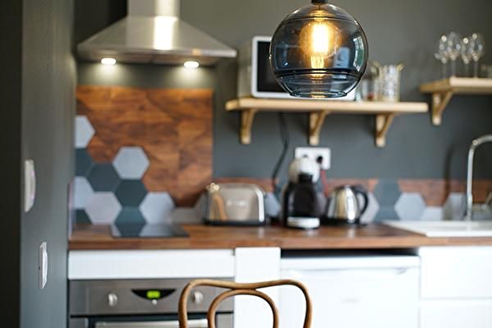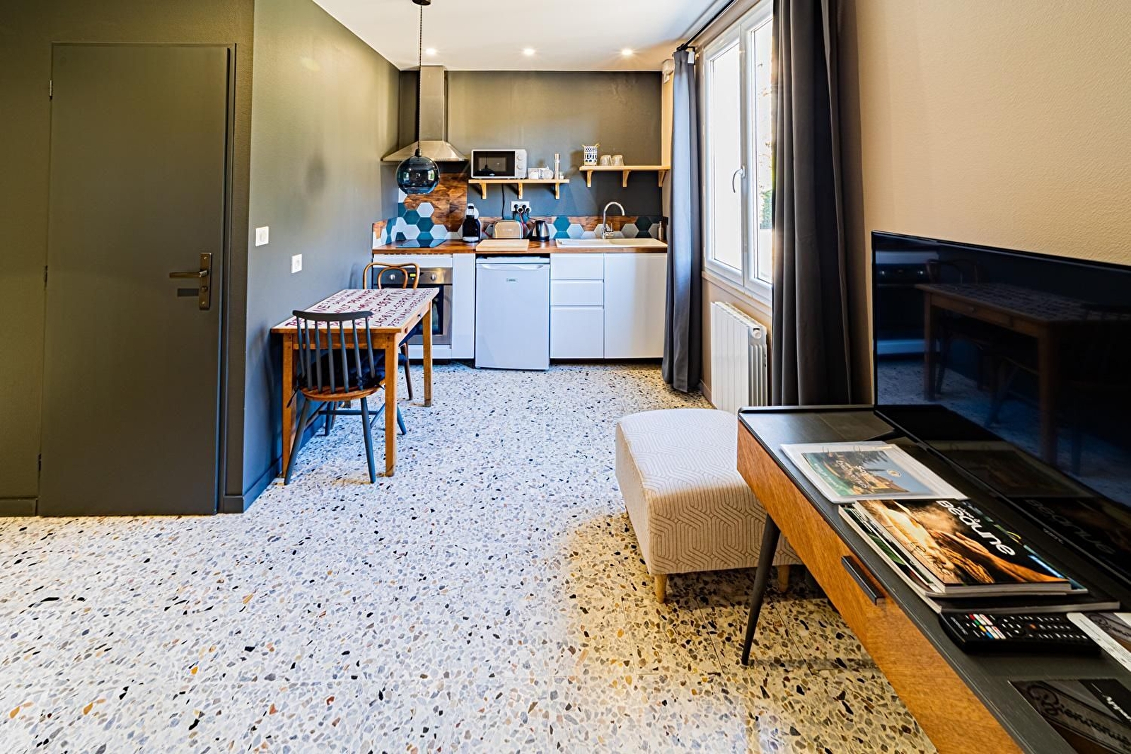 Le gîte Le Minéral se situe au 1er étage. Il se compose d'un séjour avec cuisine équipée, table à manger, fauteuils. Le coin nuit est séparé du séjour par un claustra, lit 140x200. Salle d'eau avec WC.