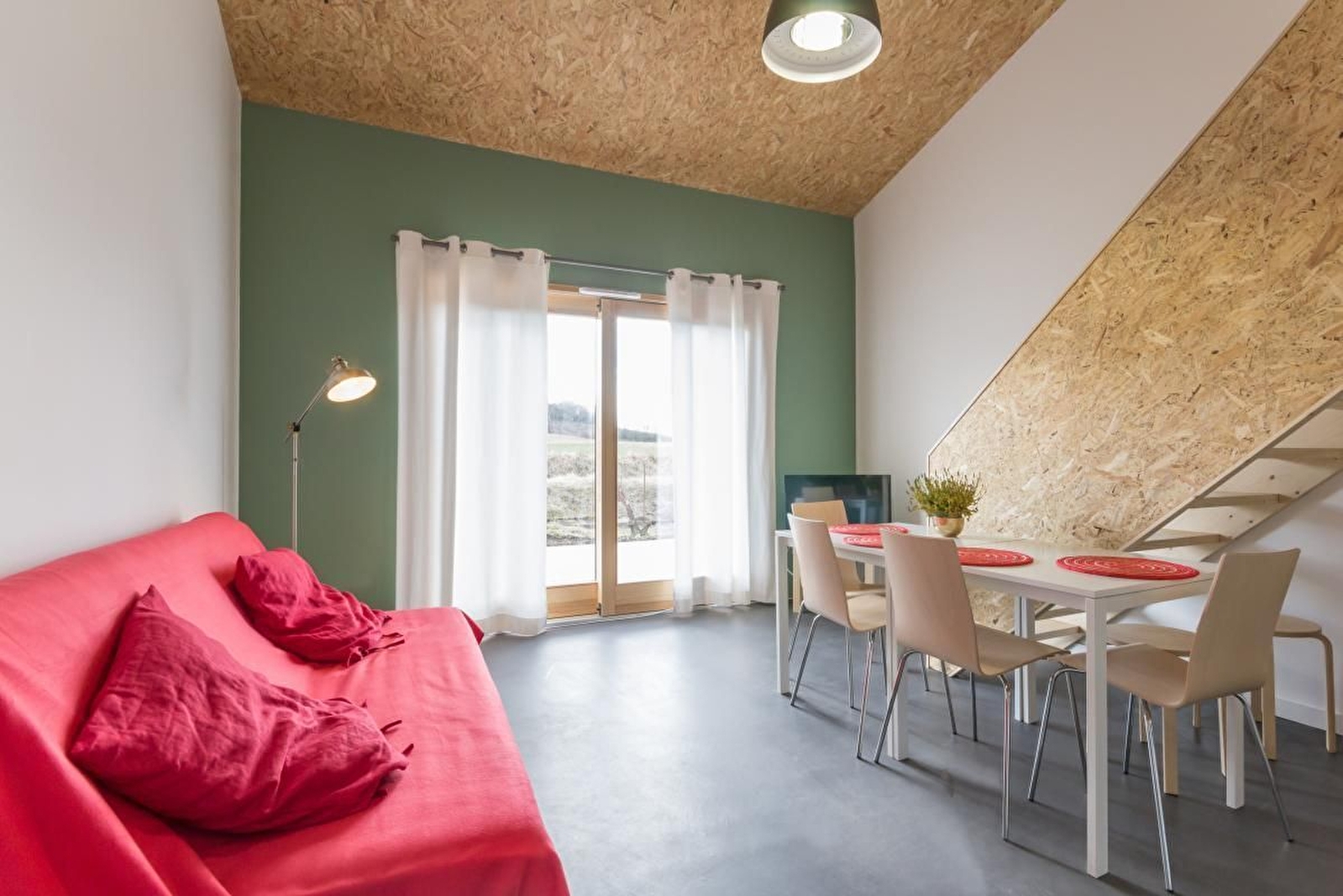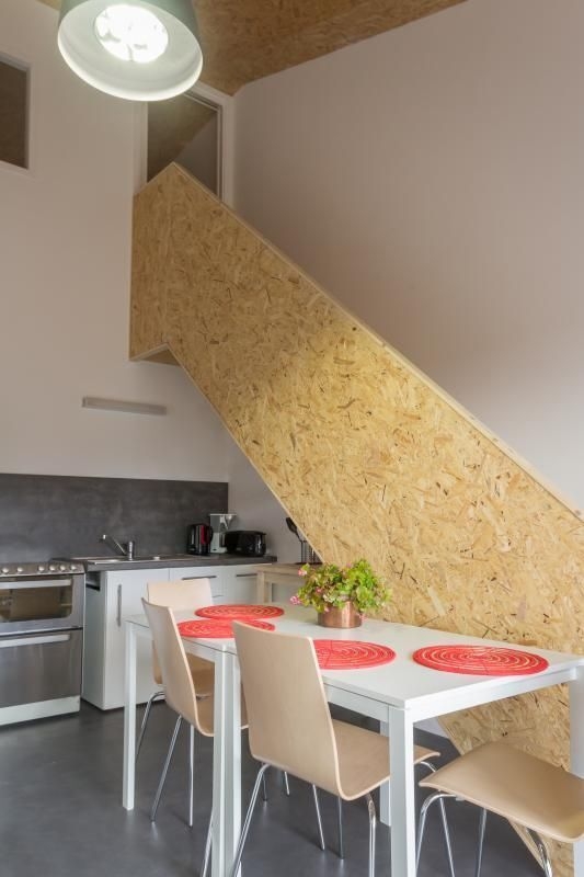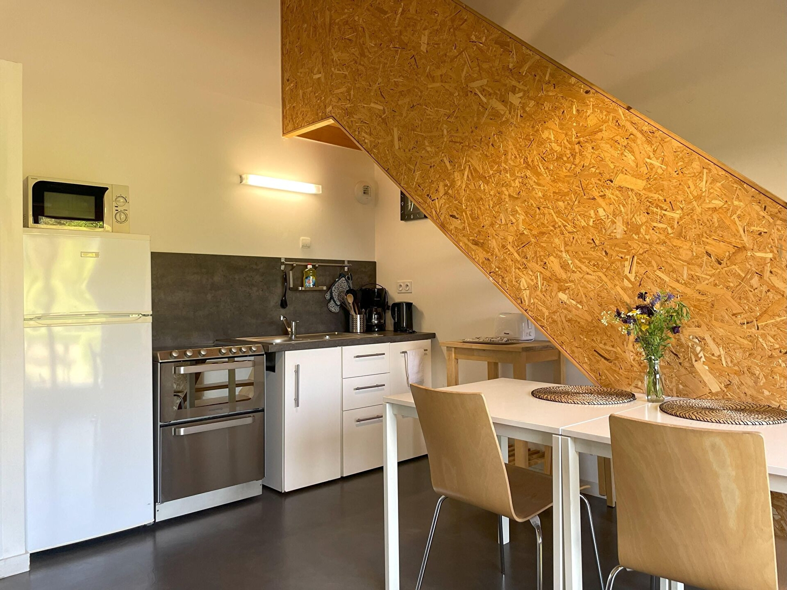 Rez-de-chaussée en béton ciré : salon-salle à manger avec cuisine équipée et accès direct à une belle terrasse en bois. Une chambre (2 lits simples jumelables en lit double). Une salle d'eau avec douche et WC. Etage avec parquet : une chambre (2 lits simples jumelables en lit double). Sur place, 2 Lits bébé et 2 chaises hautes.