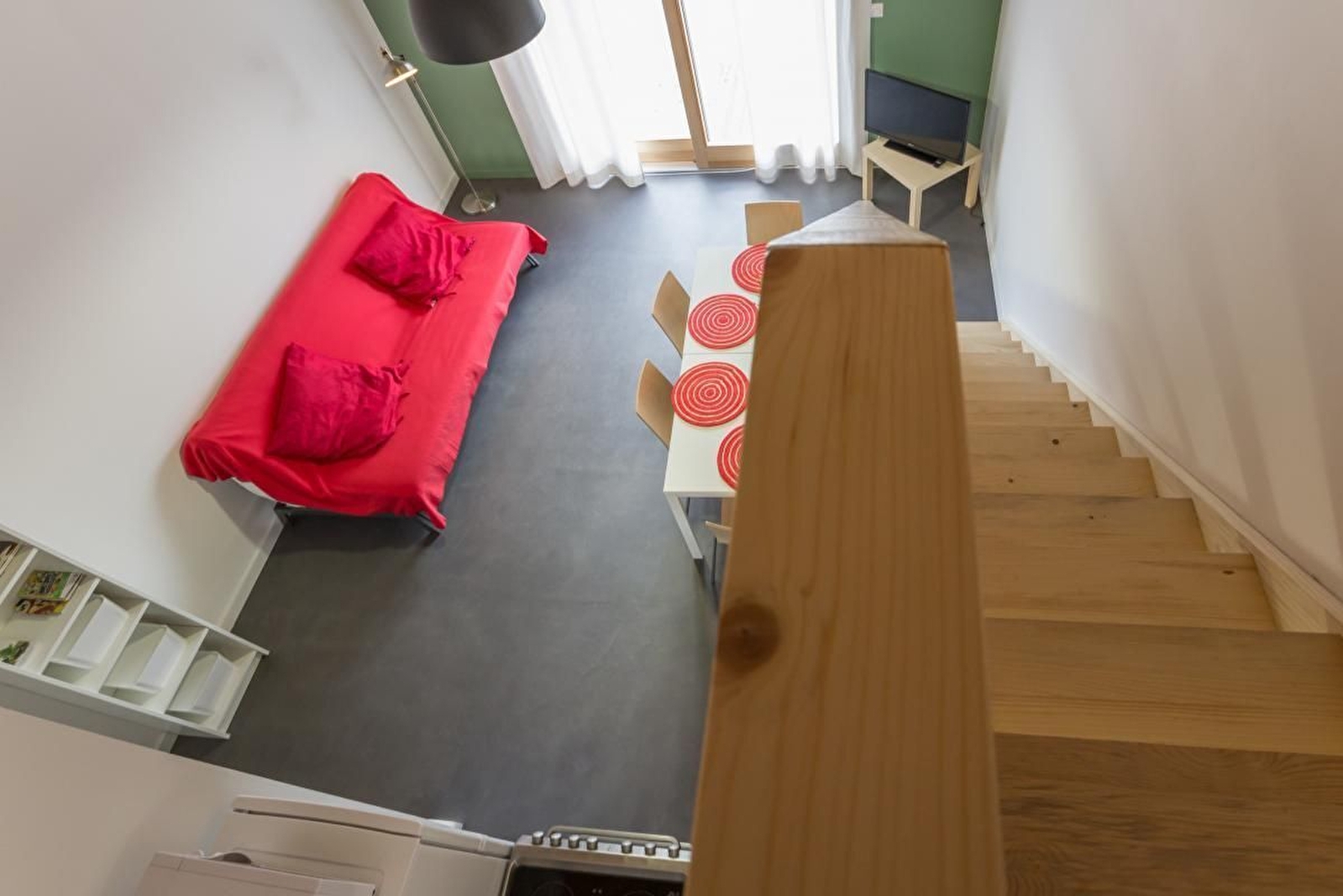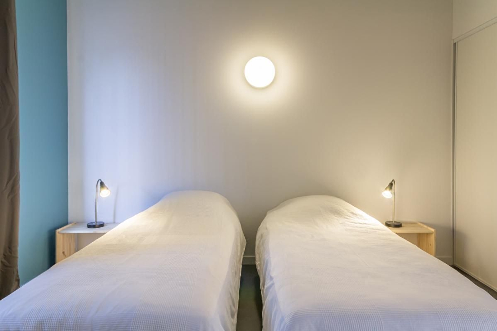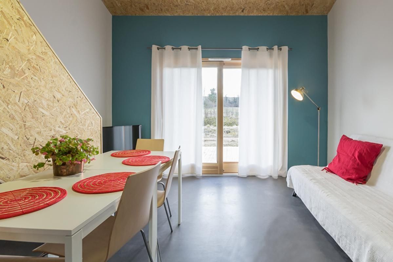 Rez-de-chaussée en béton ciré : salon-salle à manger avec cuisine équipée et accès direct à une belle terrasse en bois. Une chambre (2 lits simples jumelables en lit double). Une salle d'eau avec douche et WC. Etage avec parquet : une chambre (2 lits simples jumelables en lit double). Sur place, 2 Lits bébé et 2 chaises hautes.