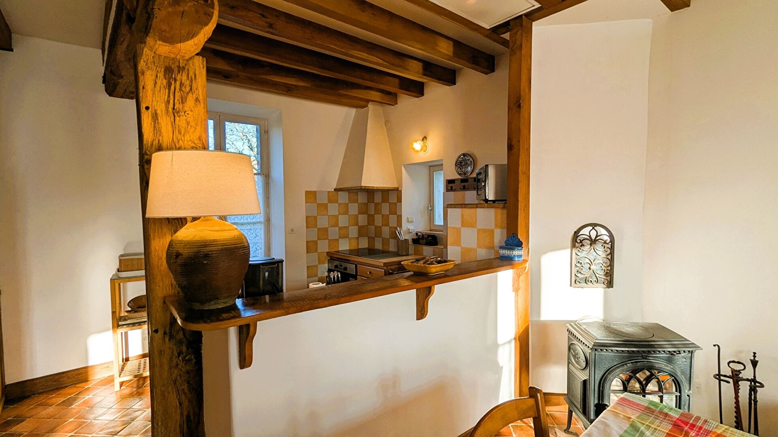 Rez de chaussée : Véranda, cuisine/séjour/salon (poêle à bois ), 1 chambre (1 lit 160, 1 lit 90), salle d'eau avec WC. 1er étage : 1 chambre (1 lit 140, 1 lit 90), salle de bains avec WC. Lit parapluie et chaise haute.