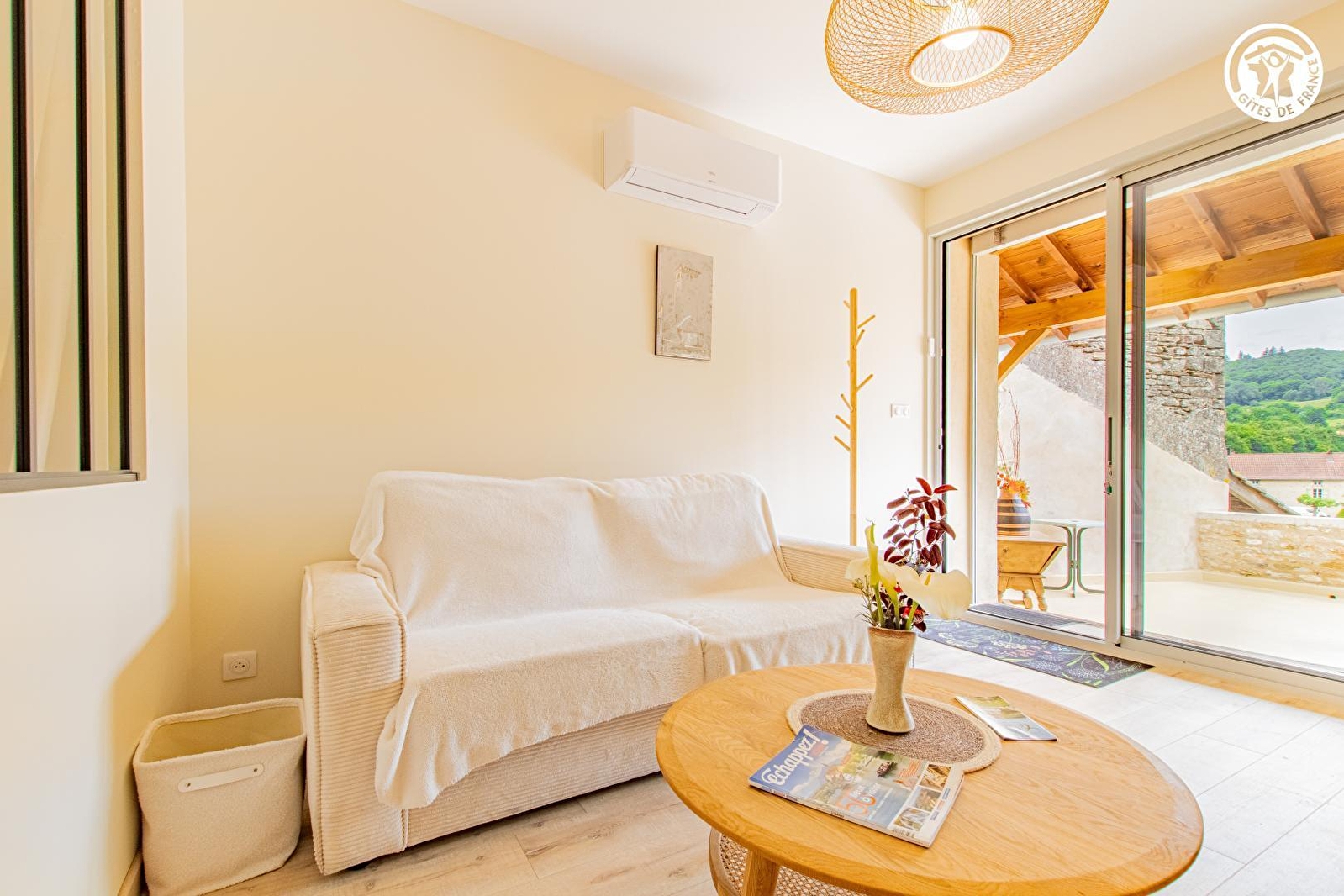 Composition : Maison de village mitoyenne. Wifi (fibre). Chauffage PAC + central au bois. Climatisation. 1er étage (accès par escalier montant par l'extérieur). Séjour-cuisine-salon (canapé convertible 2 p. 160x200cm), chambre (lit 2 p. 160x200cm), salle d'eau (douche), Wc indépendant. Balcon-terrasse (20m²) + garage (1 place / local vélos). Supérette 7.5 km. Toutes commodités dont supermarchés 11 km.