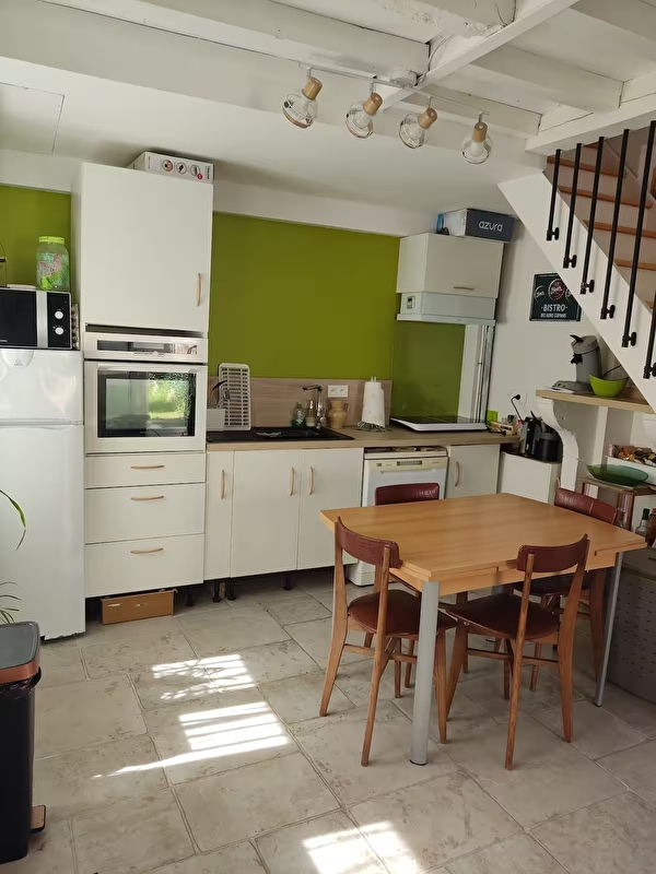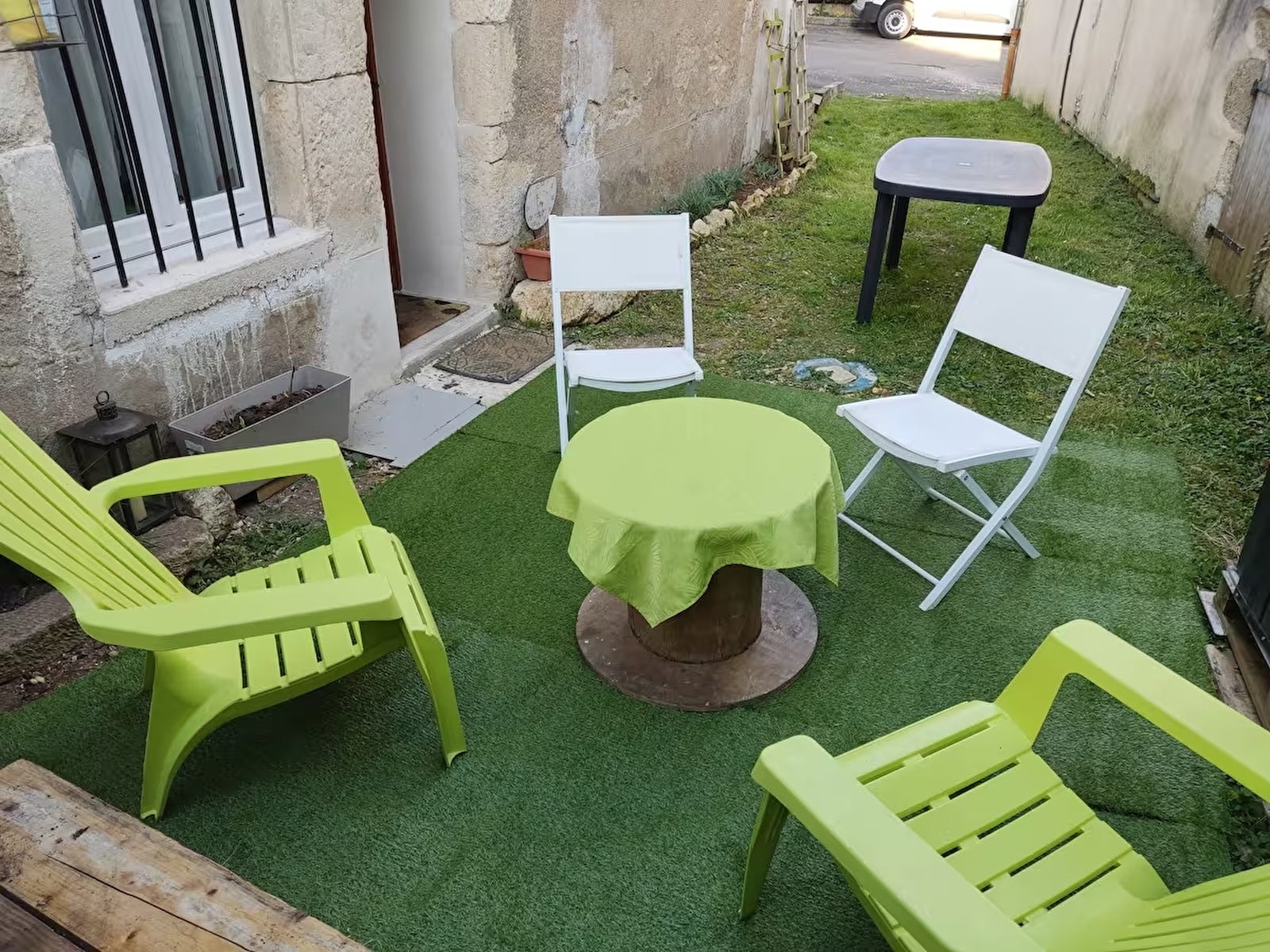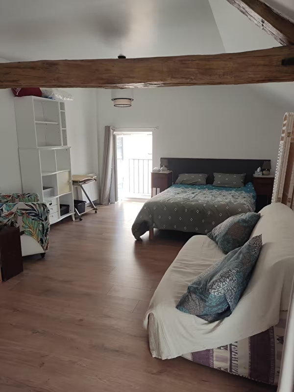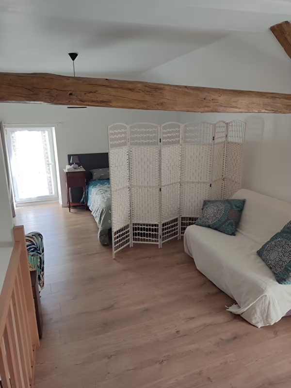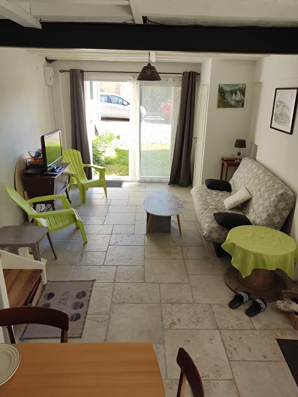 1 chambre avec 1 lit de 140 et 1 BZ, séjour ,salle à manger avec 1 clic clac, cuisine ouverte salle de bain, 2 wc, cour avec salon de jardin